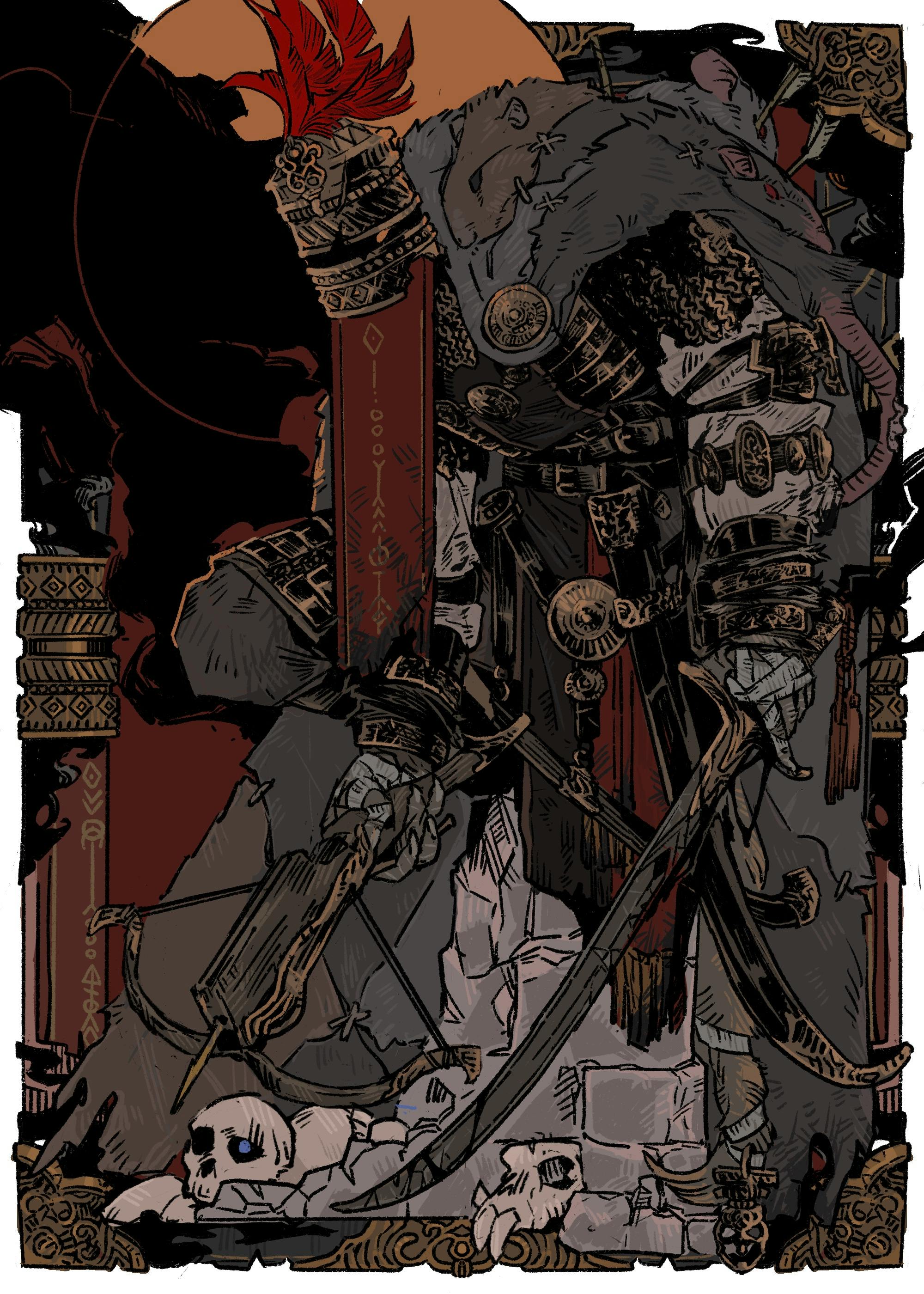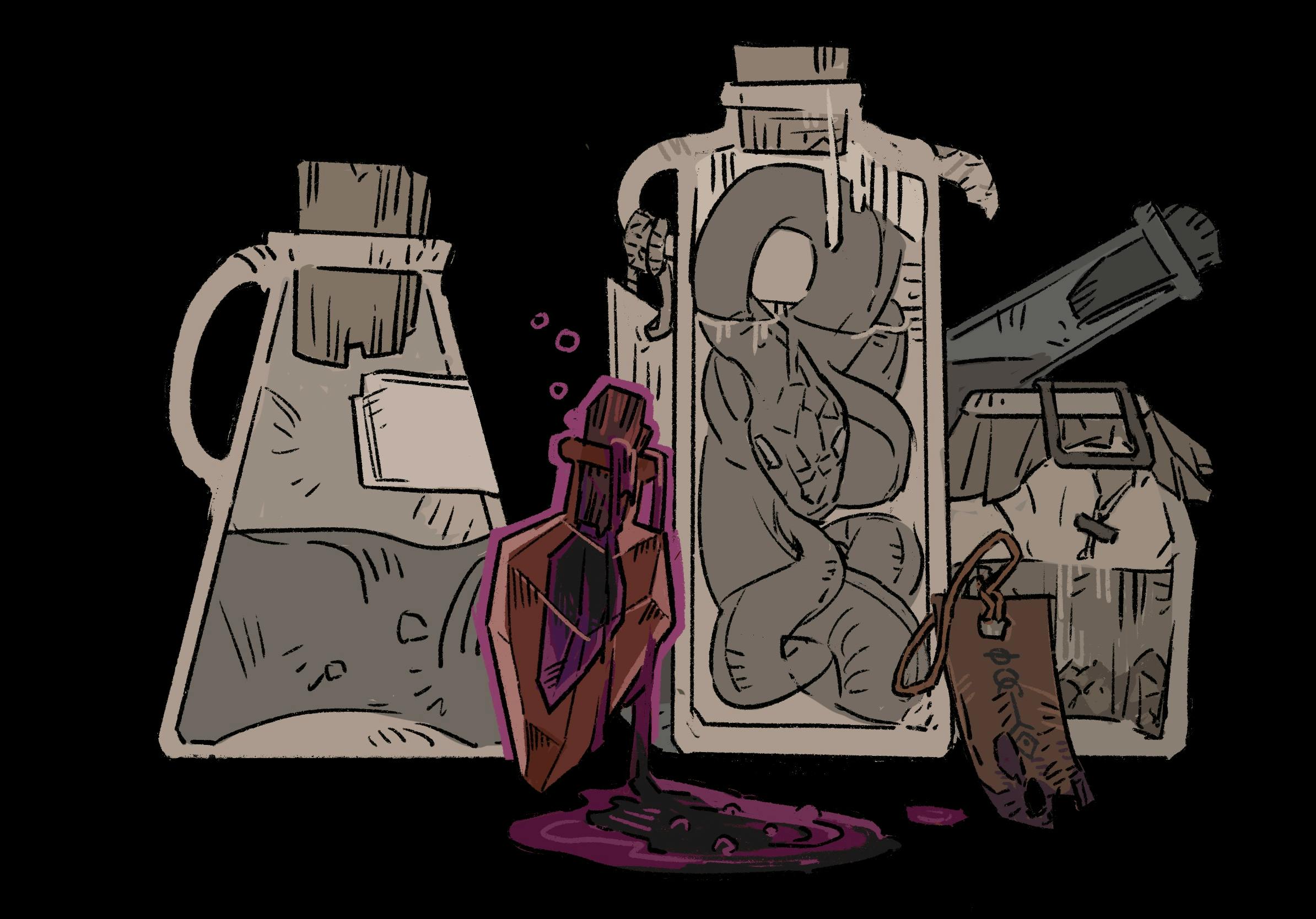 And what's that, I didn't share these previously?? Well here are some of the other pieces from before. Tomes you might find while delving, a cursed collar and mask that keeps your soul captured as it restrains you, an amulet that makes you dodge most anything... until it doesn't work and the snakes that grant you impossible grace bite you! Or diplomatic action to break up arguments might serve you well... Then there's the strange bone that, when placed down, grows sinews and muscle to seal a passage, a door way, or to create a small bridge to get you where you need to go. Then there's the Jertul Break, an item for the faithful that, when broken, grants a small miracle of salvation!