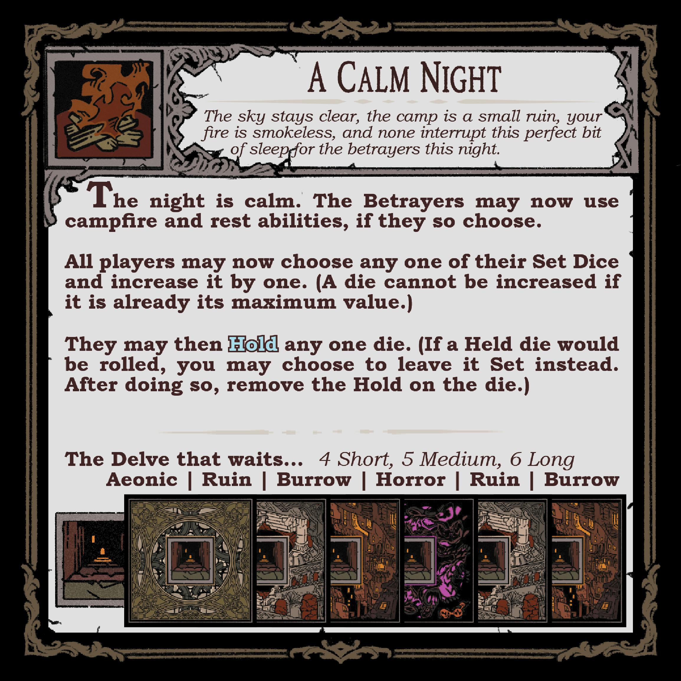 Then you come to the Campfire Card. This is when your group settles down to rest before the delve, preparing yourselves for the dungeon ahead. Campfire cards can cause problems, have you be attacked, or they can offer boons. But they tend to affect your Set dice, and they always share what the delve ahead will be made up of. In this case, the first Delve Space will be drawn from the Aeonic deck of cards. The second will be drawn from the Ruins, third from the Burrows, and on. These cards build your Delve Deck.