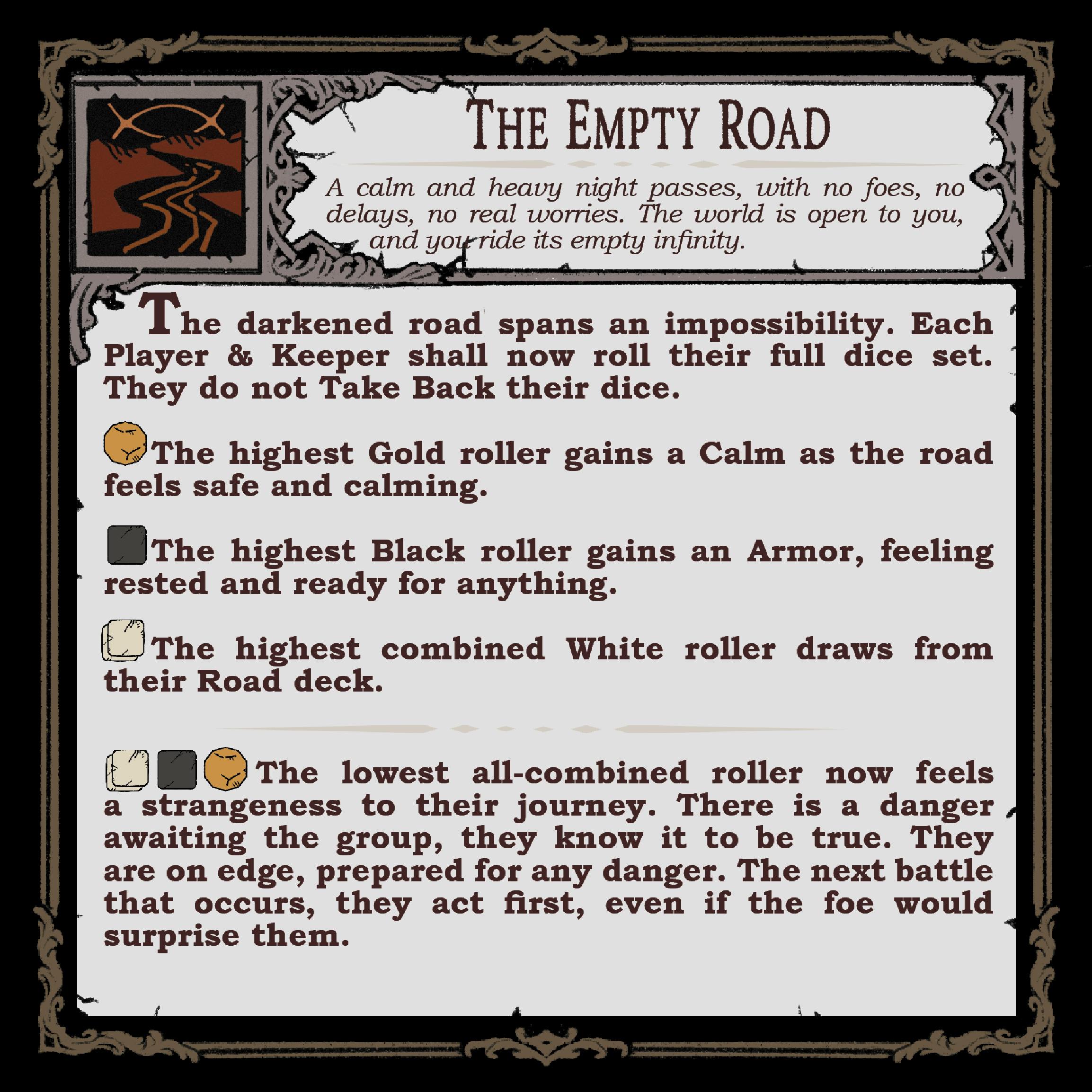 Games start with a Riding the Road Card, which shares what your ride on the Road Eternal is like. This is when you travel between dungeon delves, outriding the annihilating sun by chasing its orbit. This is where everyone rolls their dice for the first time in a session. Note that it says "They do not Take Back their dice." This means once players roll their dice, they leave the results on the dice in front of them.