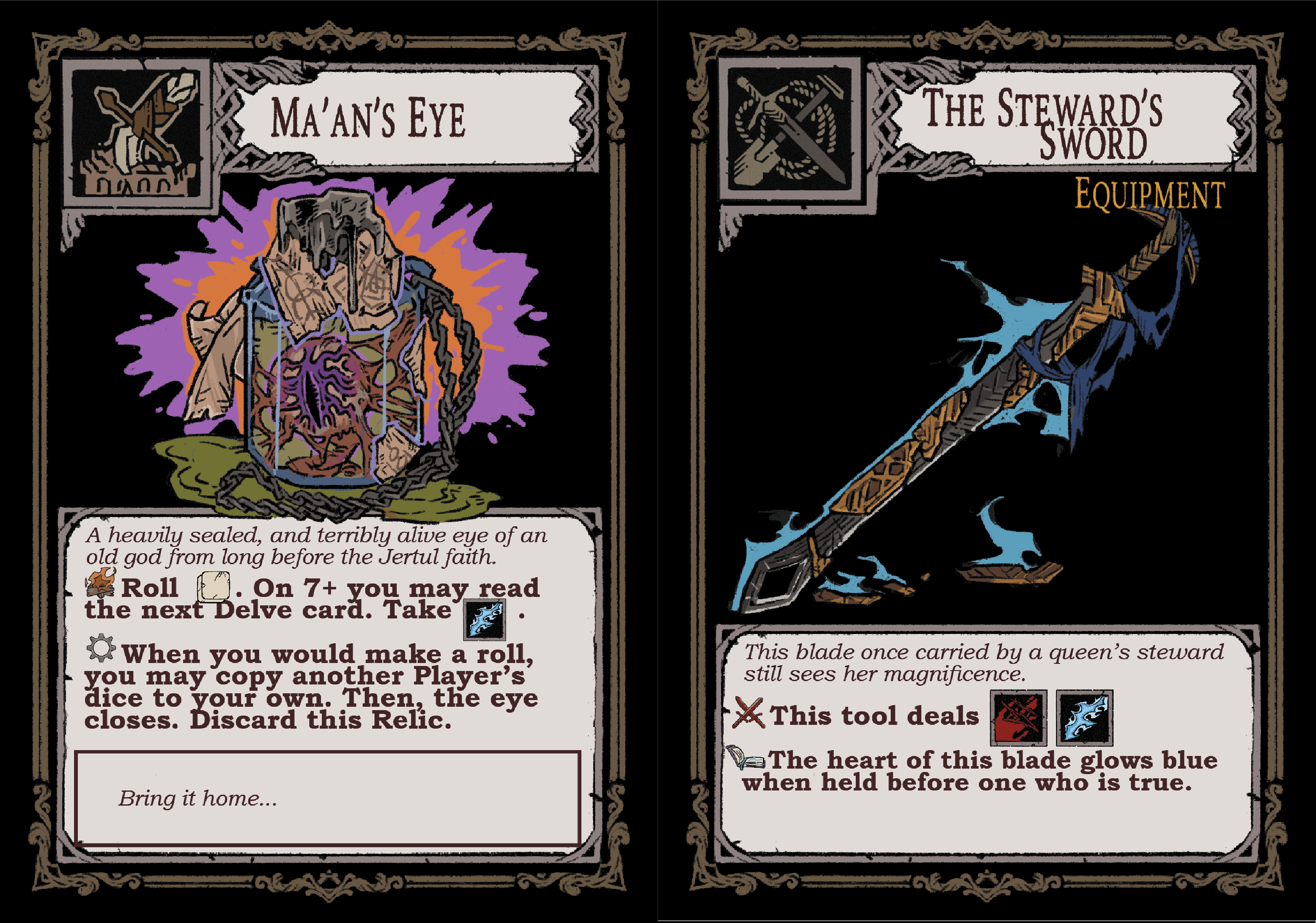 Relics and Tools here are more specialized items. Trinkets usually offer small benefits or are things you use and then discard. But Relics like Ma'an's Eye? They have unique powers to offer you, and each one has a unique sticker or two that you'll be able to add to the bottom of the card after a few sessions of play in order to unlock a powerful final ability.