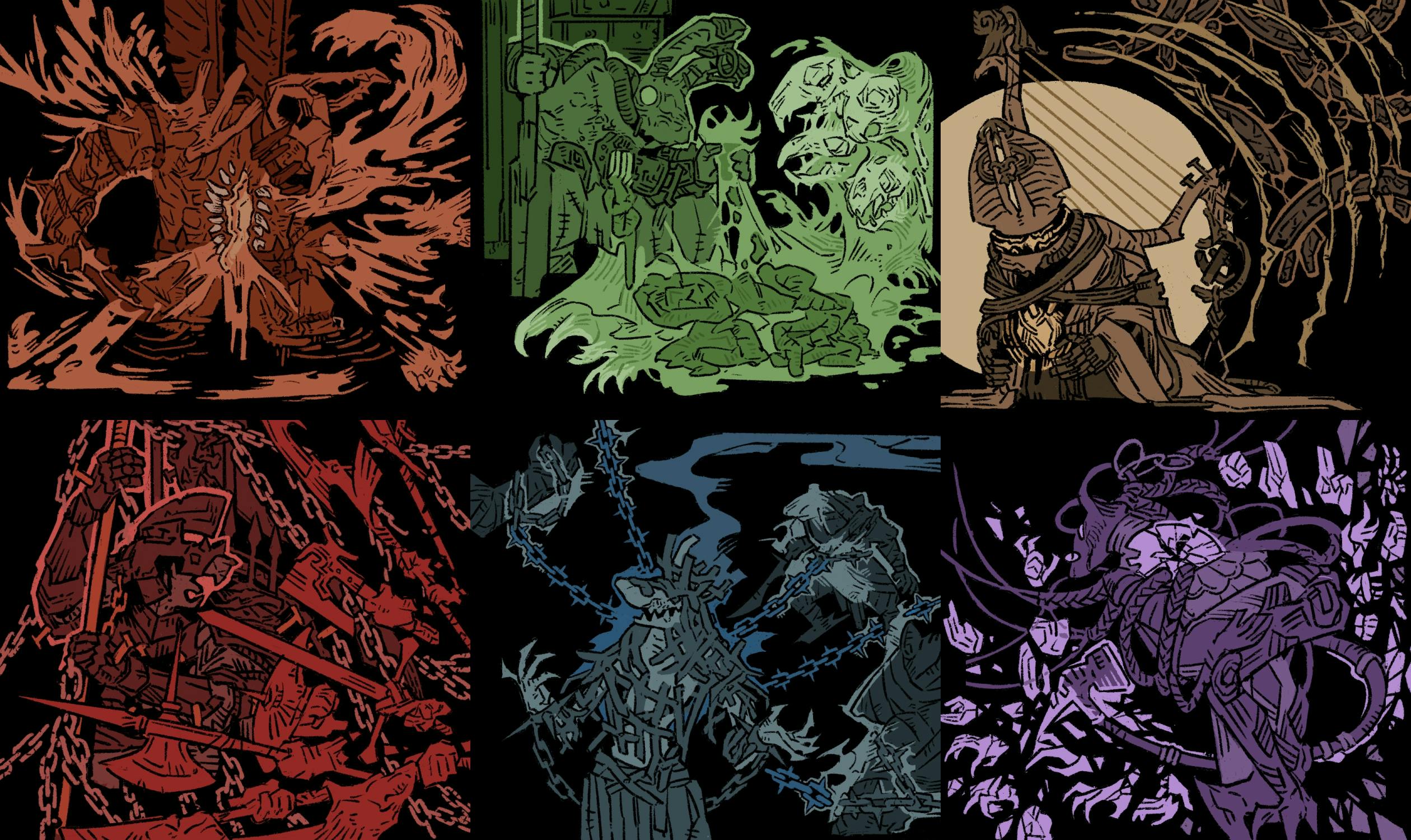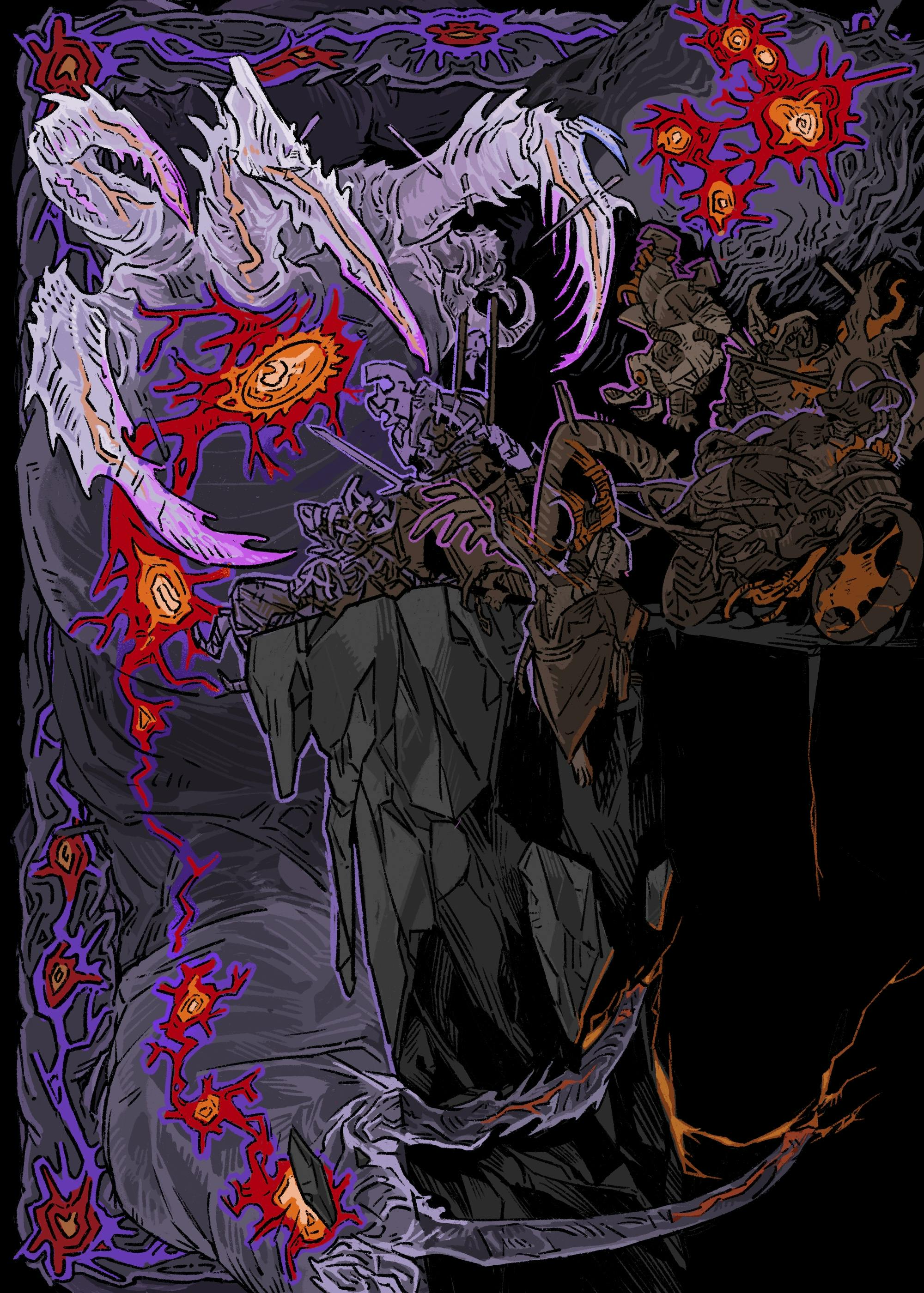 Okay, so right now, Salty Water has 10 final pieces lined. Once these are finished being colored, then there are just two bosses left for Salty to illustrate from the base game's art demands. Let's take a look at six of them below.