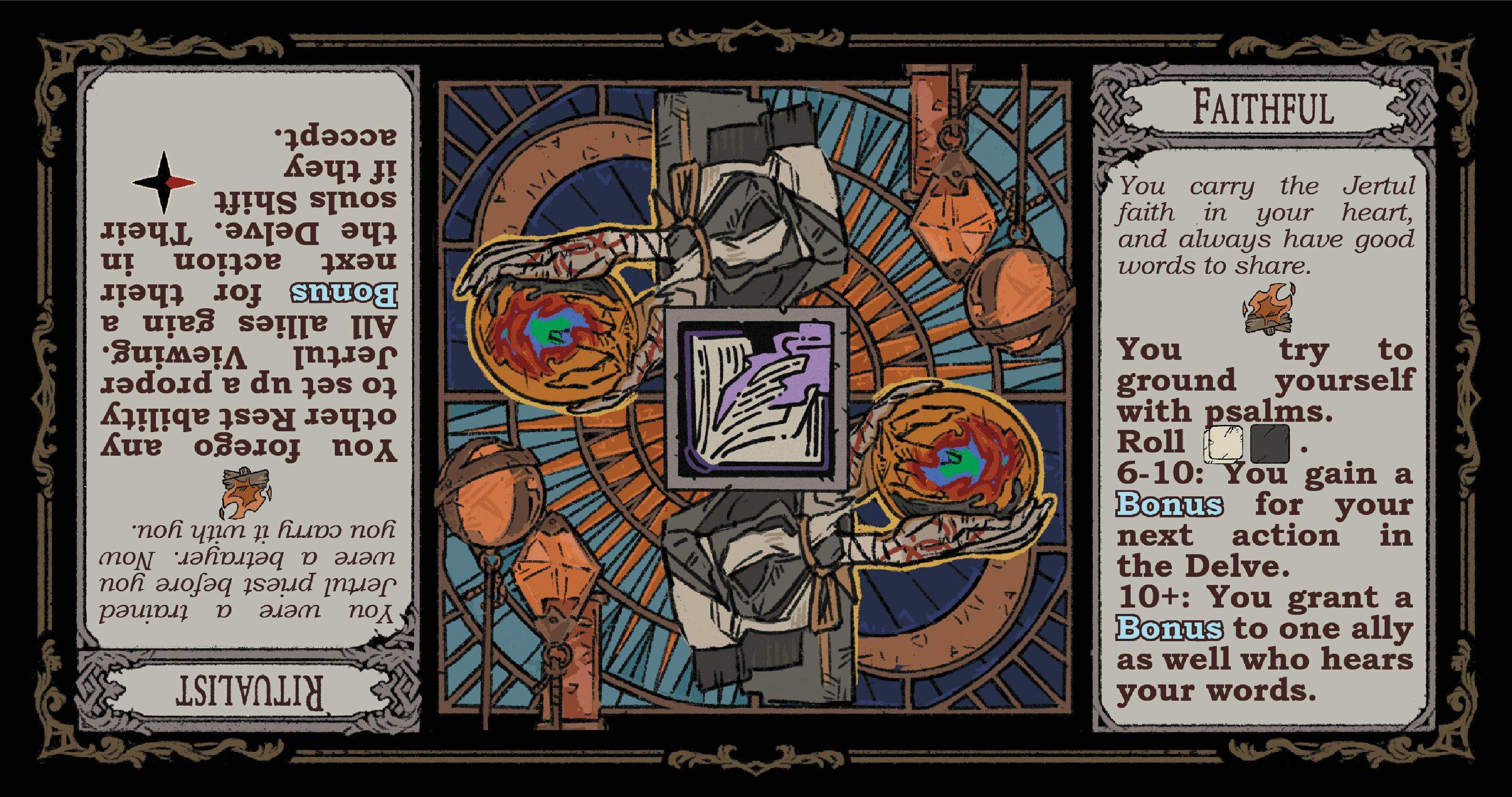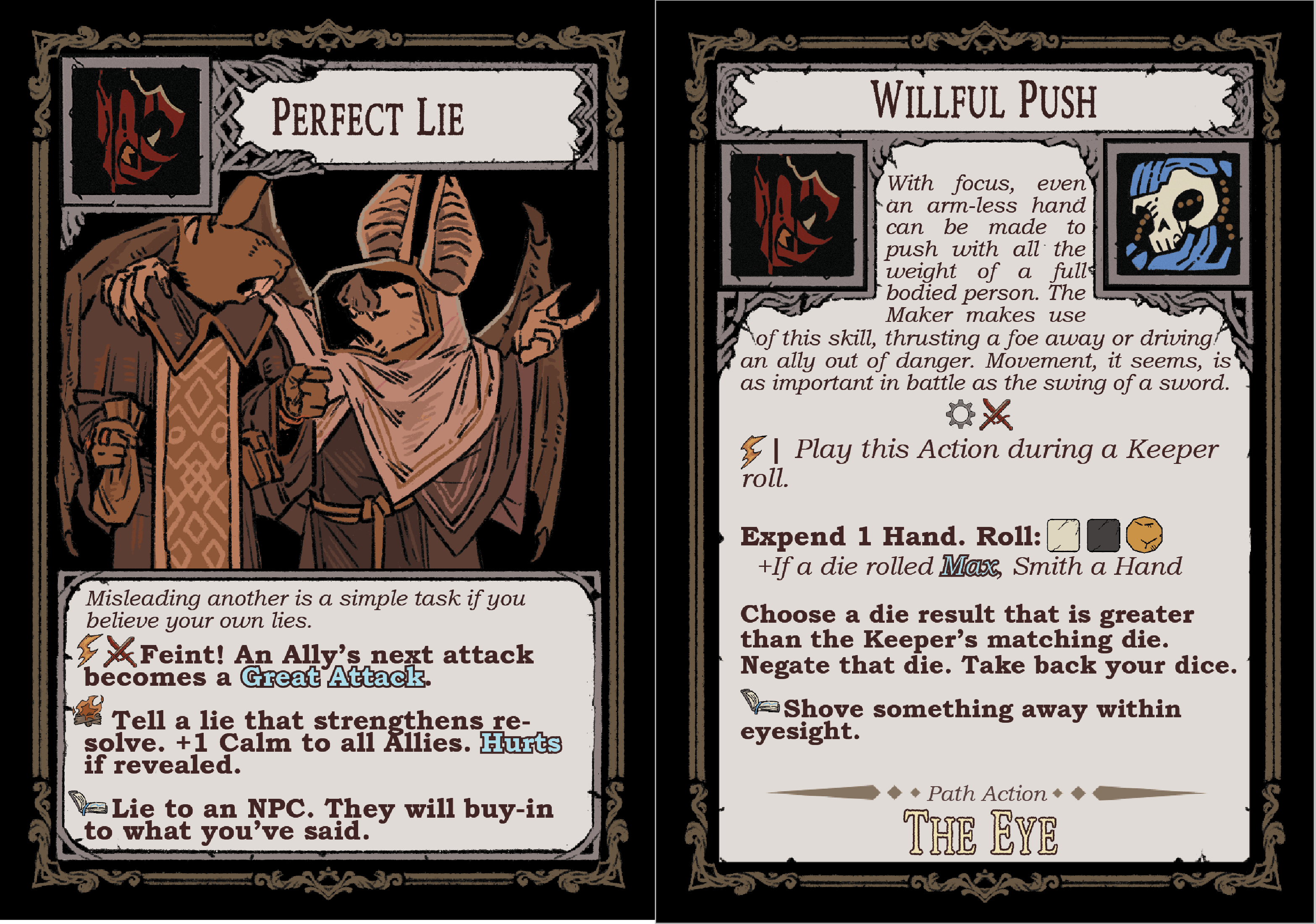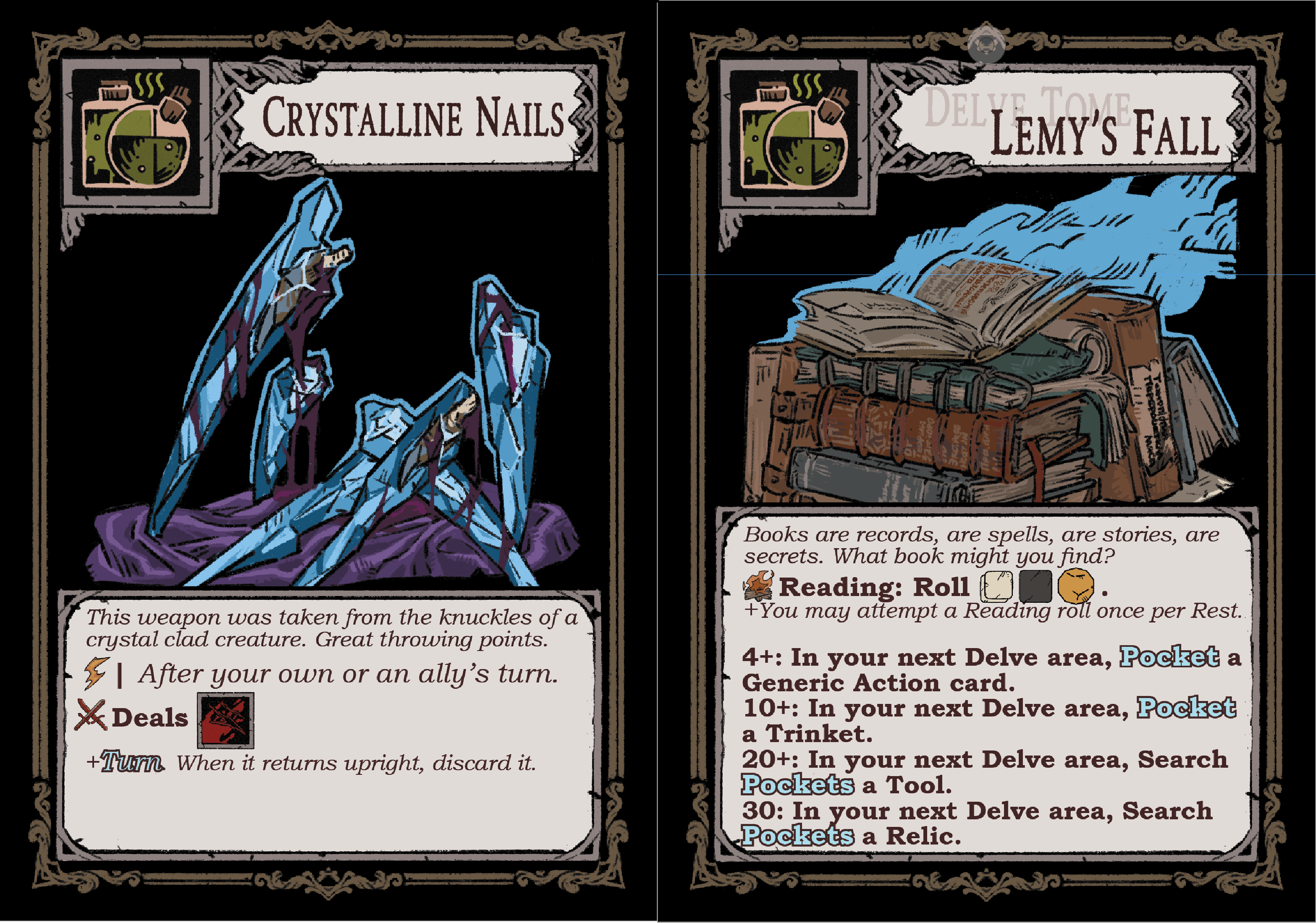 And as I wrap design work on characters, I am folding their mechanics across other cards, actions, tools, trinkets, delve cards, to make sure everyone is melded into the game.