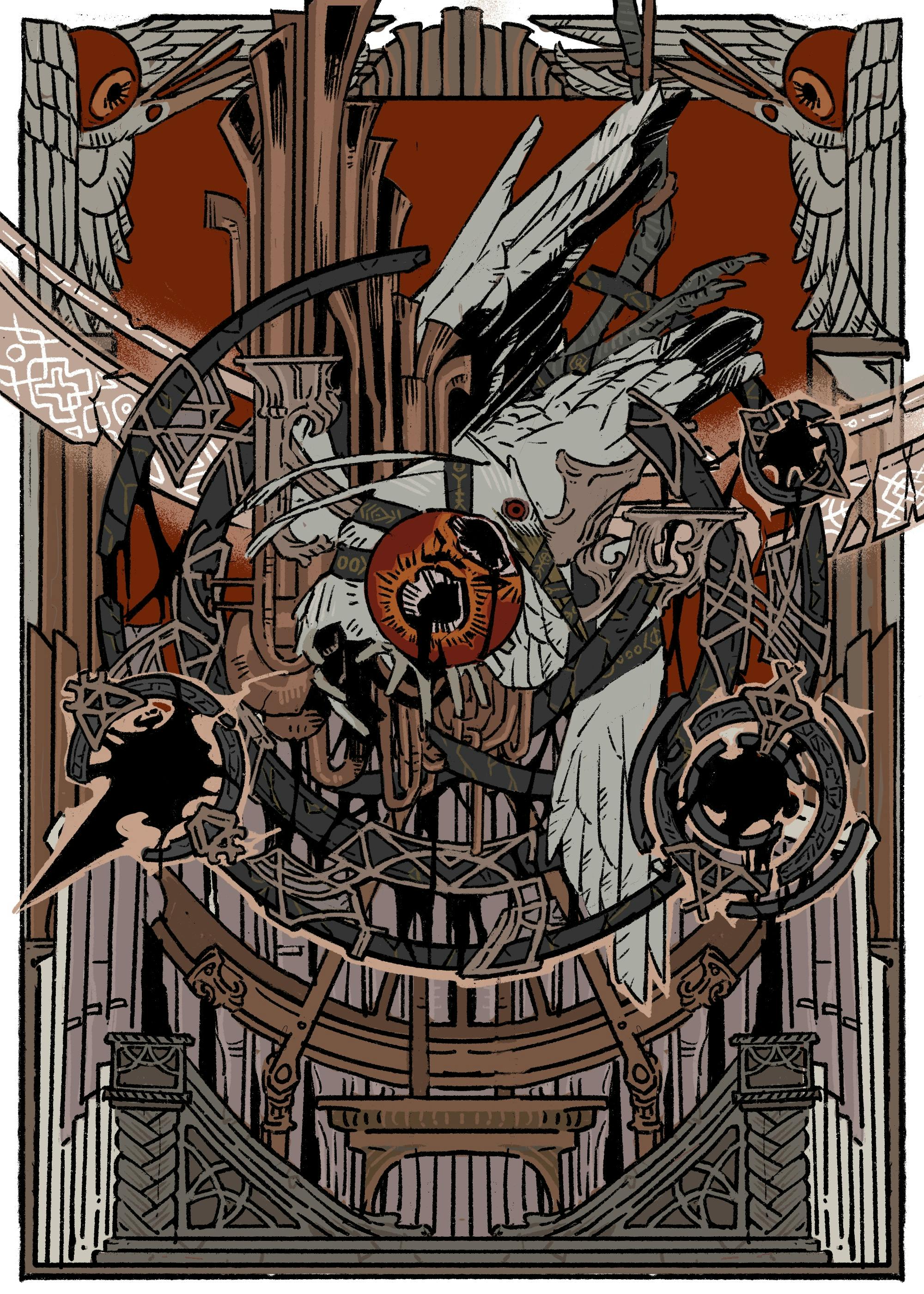 And an Aeonic machine, a winged eye and set of rings that has settled down on its altar of organ pipes to play its godsong. To fight this one, you'll have a short number of turns to act against it before it settles on the altar. Once it does, its power will grow massively, as will its number of attacks.