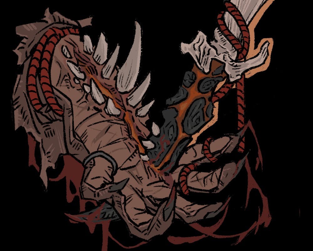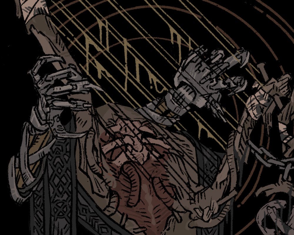 And while we have already seen the class-tools of the Collector of Skulls and the Maker of Hands, their chain wrap and gilt hammer respectively, we now have the remaining class tools. The Stoor-iron shovel of the Organ Eater, used to beat enemies over the head and dig up bodies to harvest. The Benthine Daggers of the Caged Wraith, broken away over time but animated with their ghost blades. The Aeon Call of the Aeon Caller, the harp made across their own torn apart wing bones which they use to call angelic horrors to their side, or to support their allies. The Inward Knife of the Malefact Bonecutter, which they use to release their blood and bones to grow and turn into armor or weapons, or a weapon against foes in a pinch.