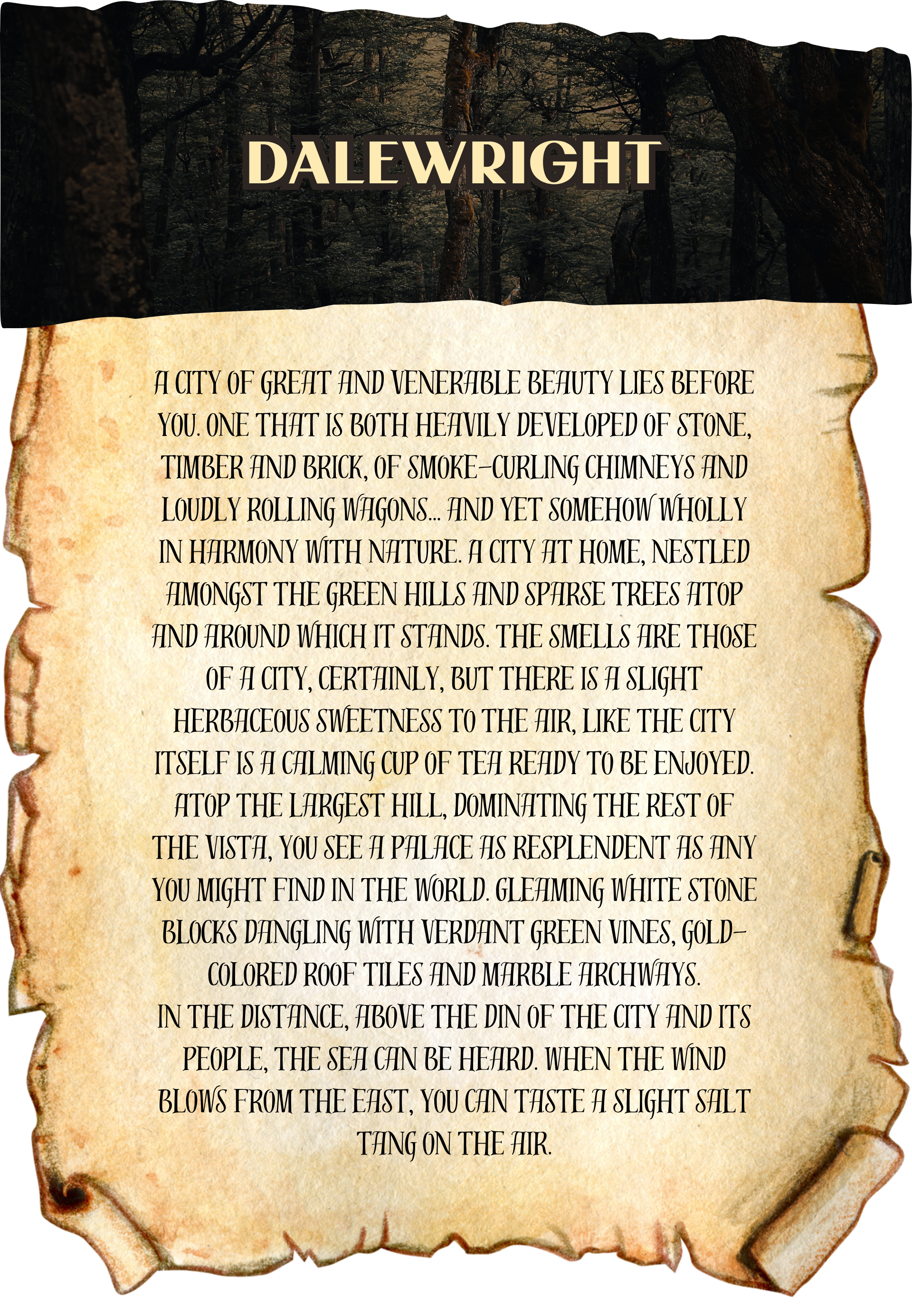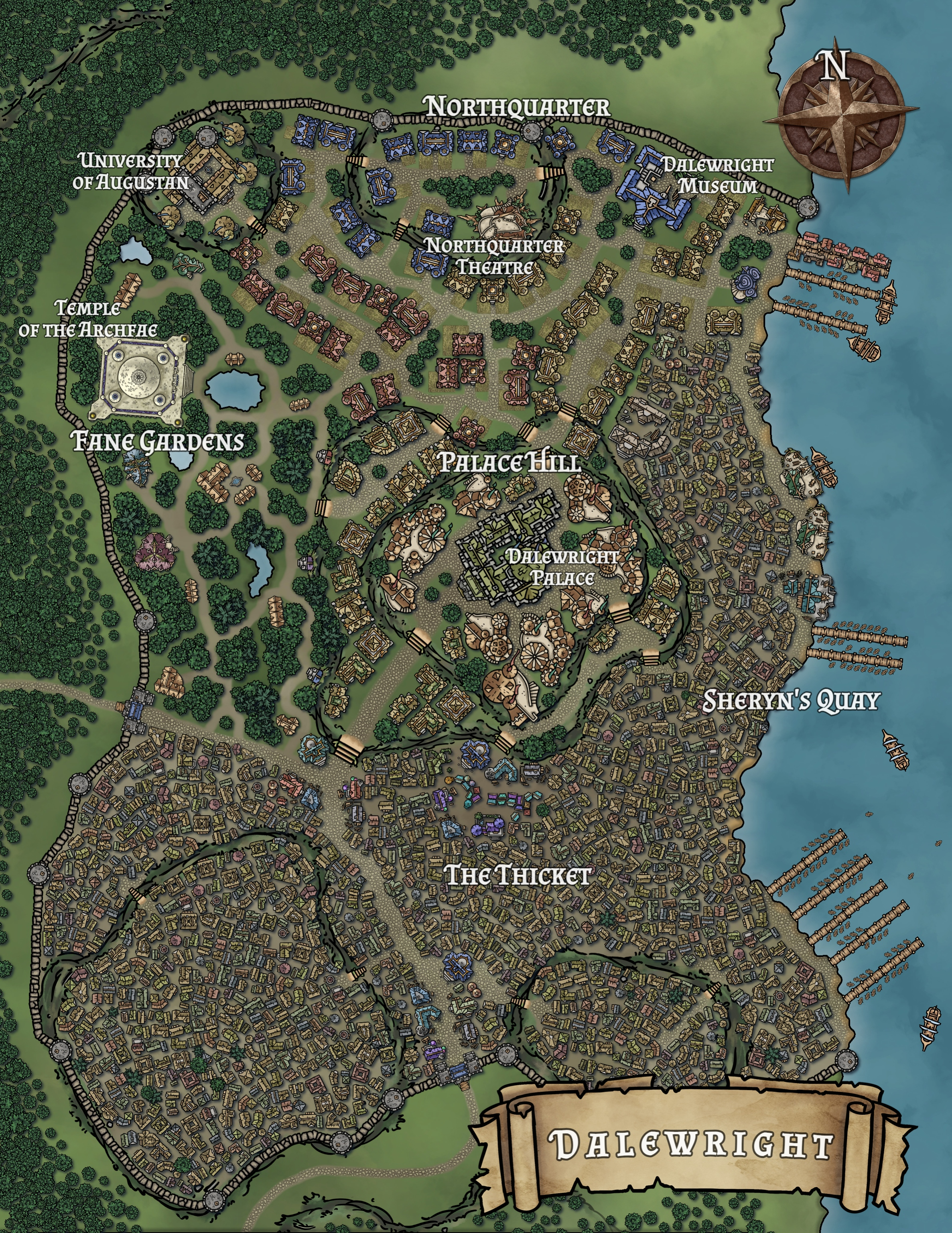 While some in Grace Grove would disagree, Dalewright is officially the capital of Kendaria and is the seat of power for Queen Astaria Gillian III. A prominent port city on the continent's east coast, Dalewright thrives off of maritime trade. The University of Augustan also draws a great number of curious academic minds. Enroll in classes or spend your afternoon strolling the Fane Gardens or haggling in Sheryn's Quay!