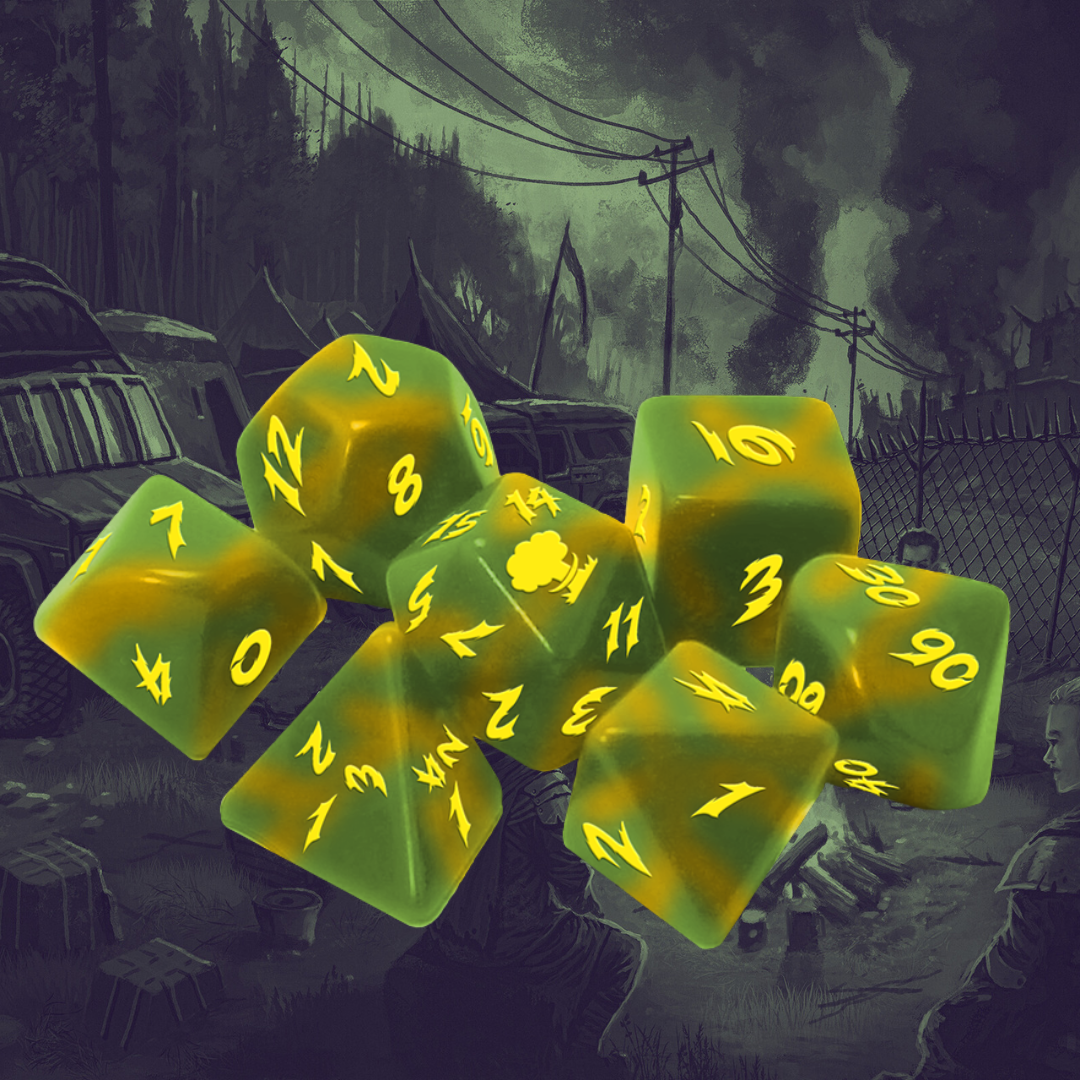 The Unraveled VIP dice are a full-sized set of tumble dice featuring Unraveled colors, a custom font, and a custom icon on the 20 of the d20. You know we take our dice seriously around here. This isn't salvage, these are pure, preserved, old-world, pre-war collectibles.