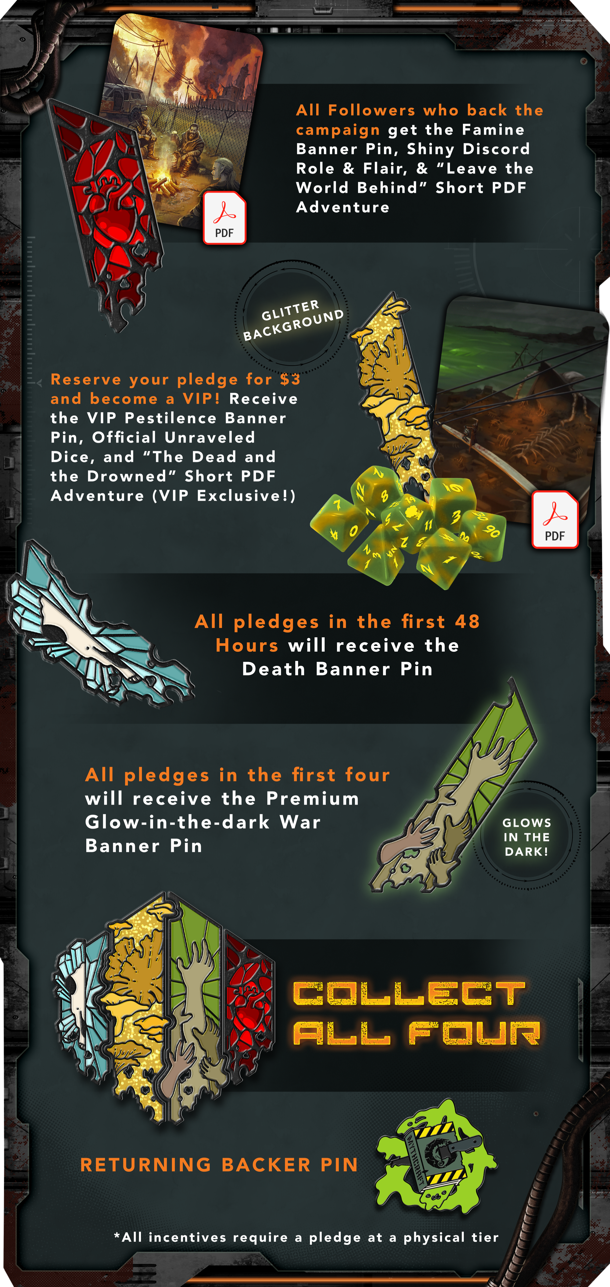🫀Follow the campaign for the Famine Banner Pin 🍄Reserve your pledge for $3 for the Premium (Glitter) Pestilence Banner Pin 🧊Pledge in the first 48 hours for the Death Banner Pin 🧟Pledge in the 1st hour for the Premium (Glow in the dark) War Banner Pin