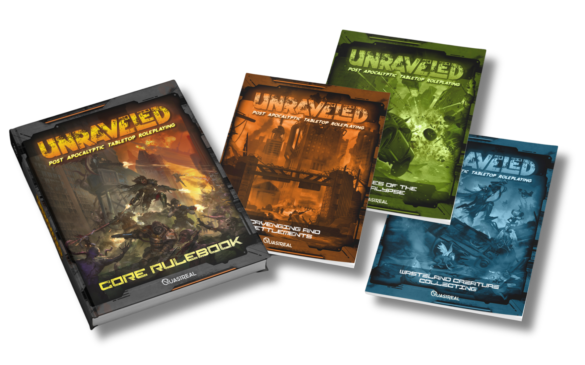 Below you will find the Core Rulebook, and 3 module covers: Scavenging & Settlements, Vehicles of the Apocalypse, and Wasteland Creature Collection.