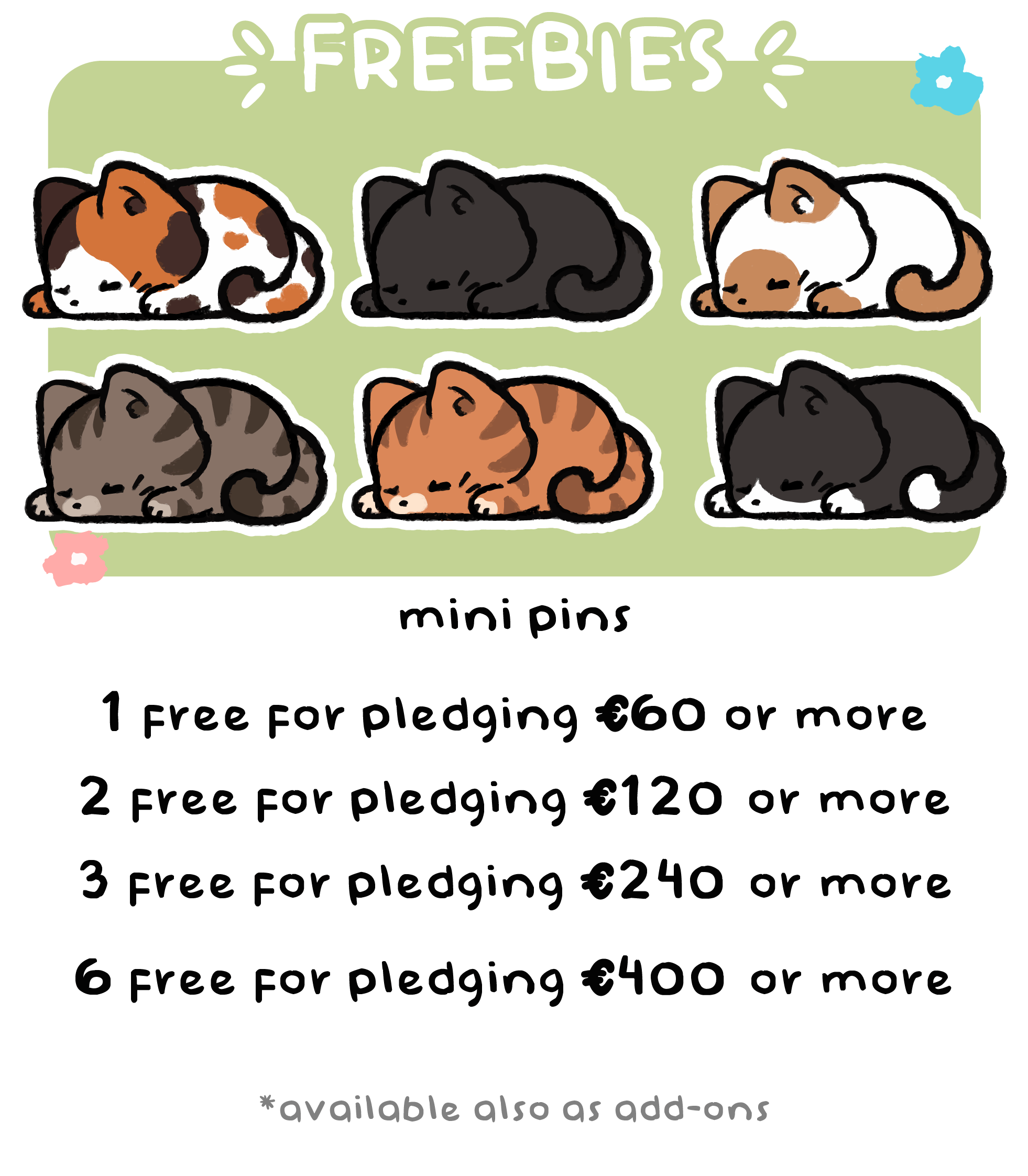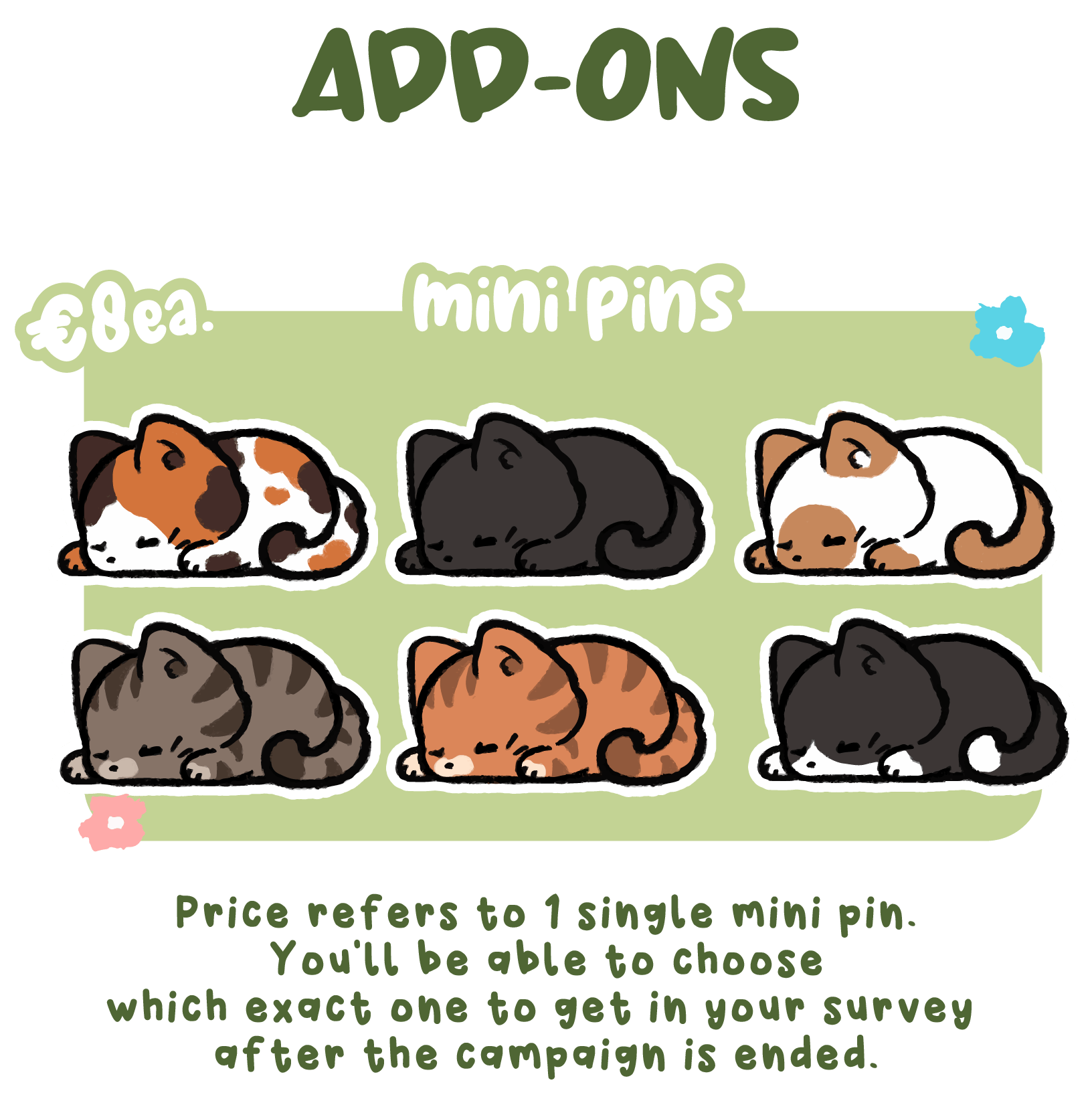 The main focus of the campaign is around making our adorable kitties into enamel pins: we have more than 30 designs ready to be adopted and each goal will unlock one. But we also aim to unlock more: deskmats, hoodies, pin banners, cups... and maybe even tote bags and beanies! It's all up to you and the love you'll show to these kitties ♡