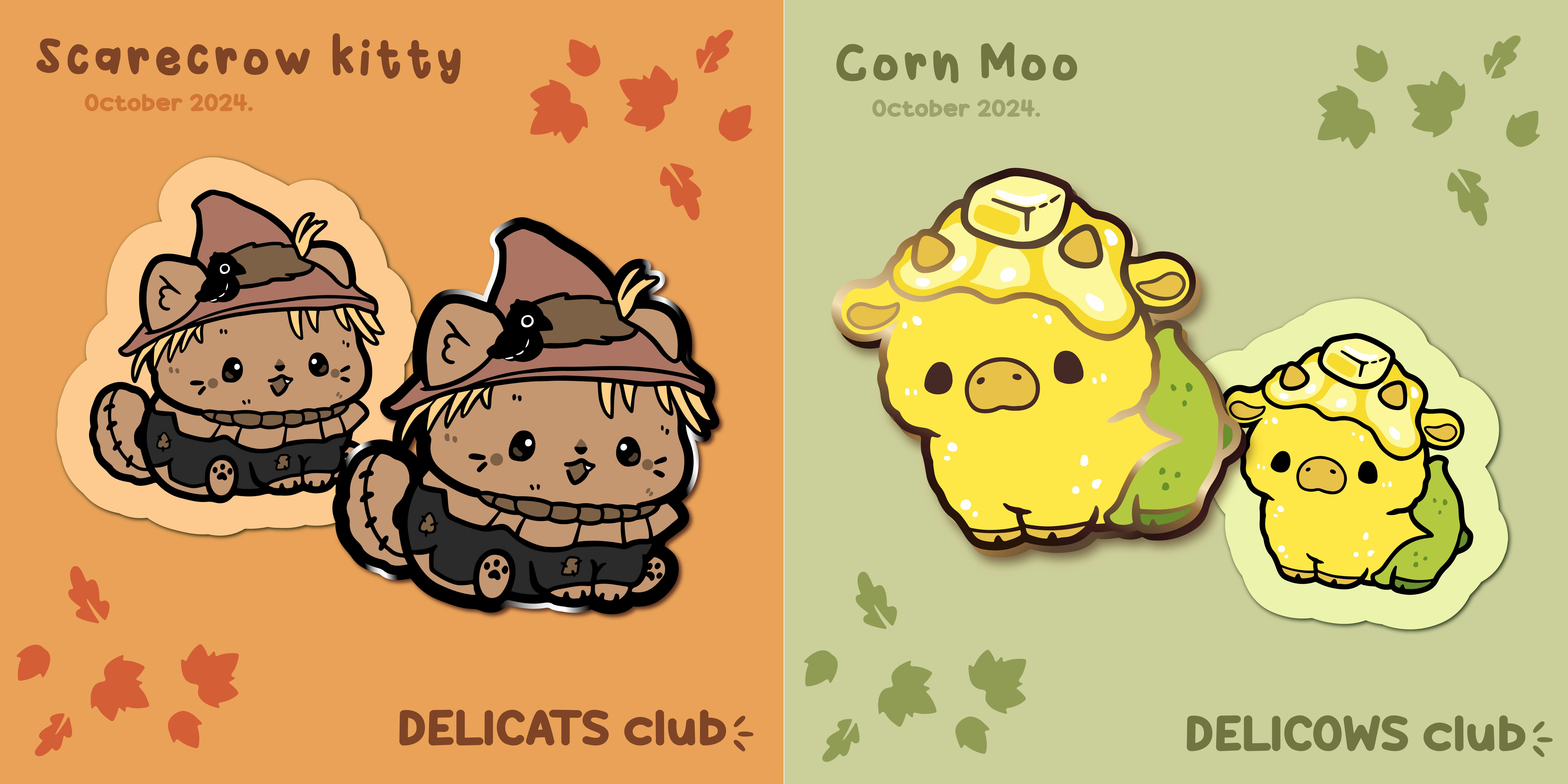 Join our newly opened Delicats pin club on Patreon within Sep 30 to receive a Scarecrow kitty pin & sticker! /ᐠ - ⩊ •マฅ₊˚⊹♡₊ ⊹ * Or you can even indulge yourself into some Corn Moo joining the Delicows club! 👀🌽 Or why not both joining the Deluxe club instead? 🐮🍂🐱