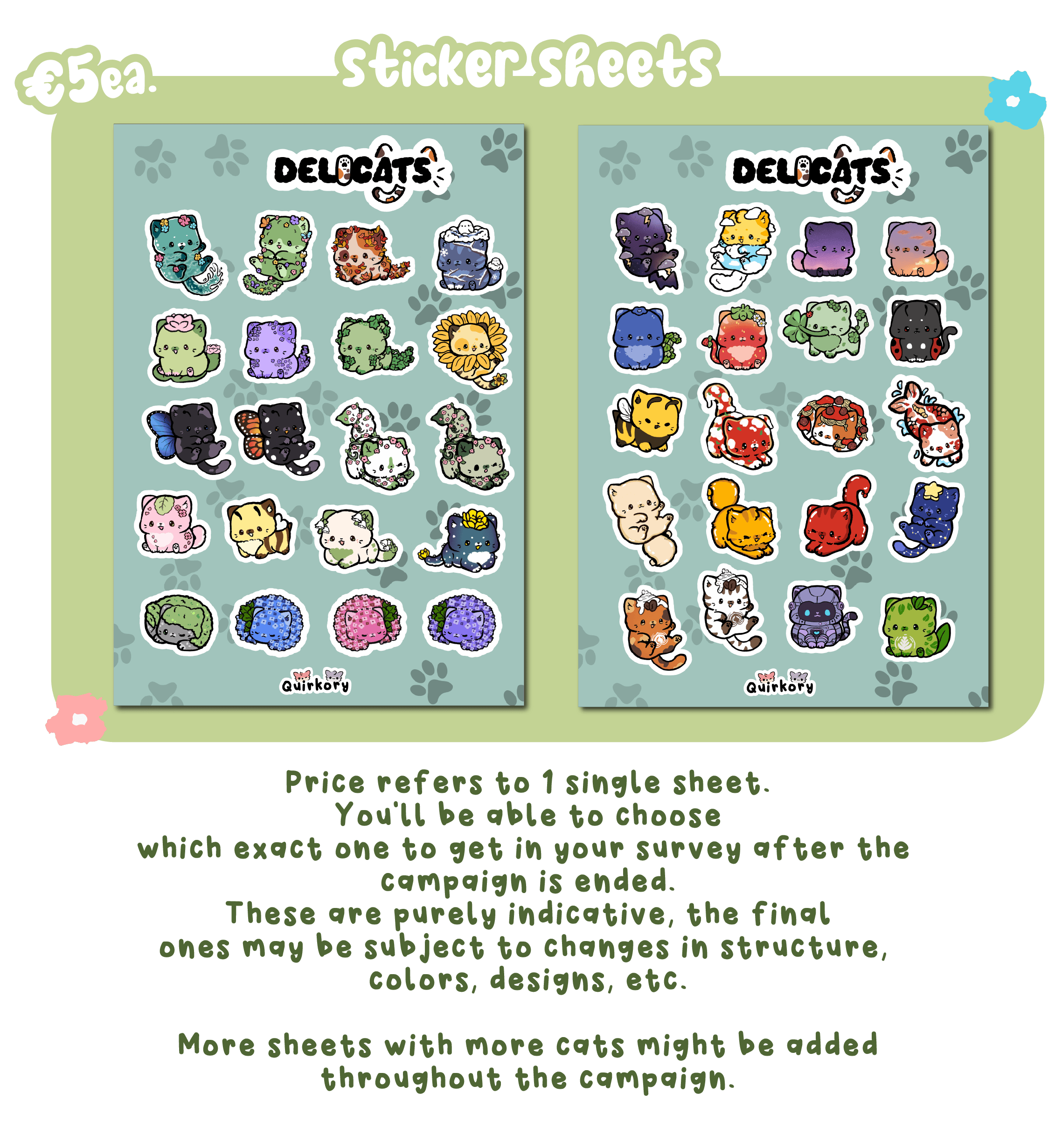 You'll be able to choose which Delicats you want from all the unlocked designs through a survey -once the campaign ends. The initial goal of €450 will unlock the first Delicat, Summer. The more we raise, the more kitties will be unlocked!