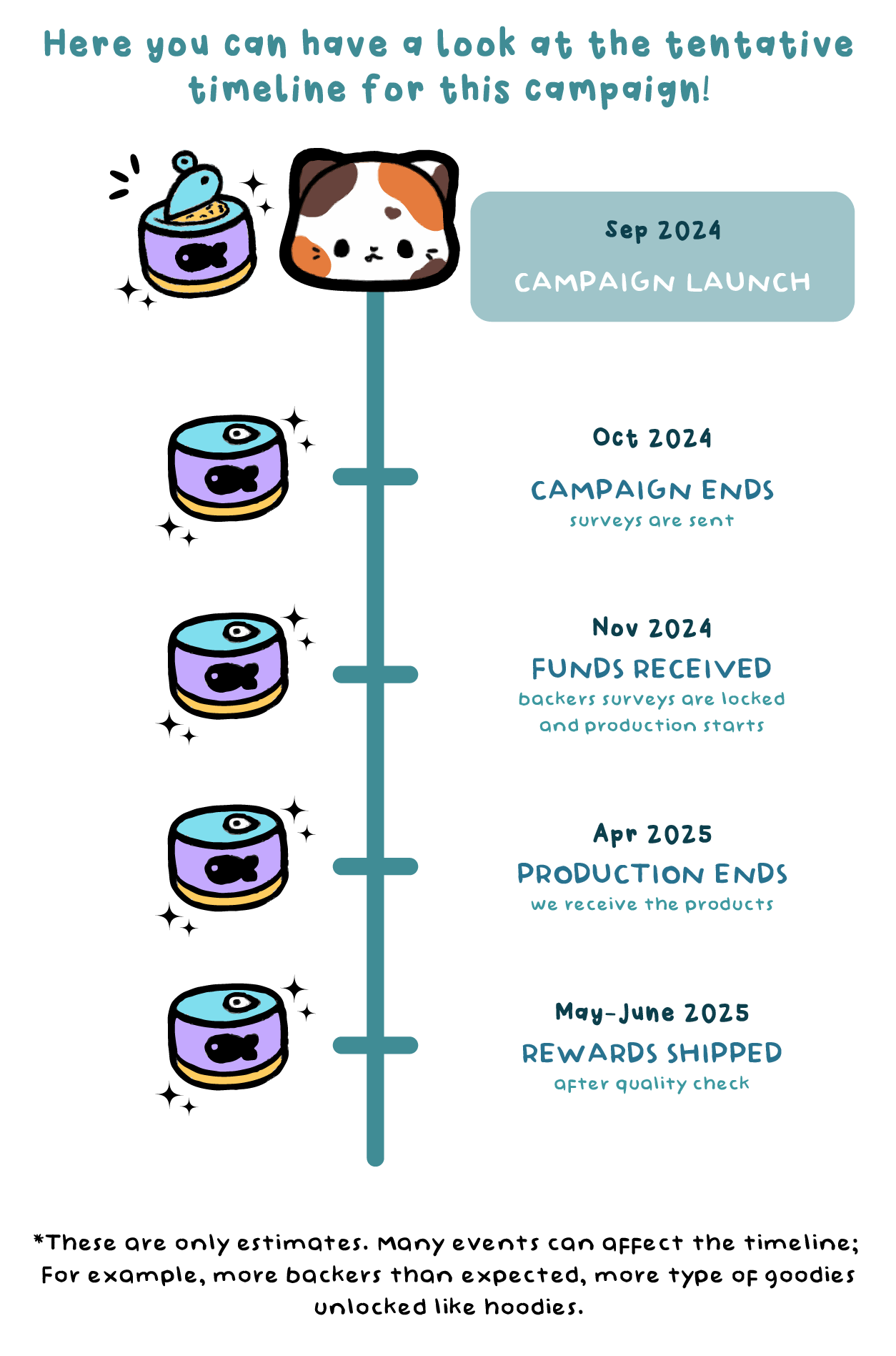 Once the campaign wraps up, you won’t be able to change your pledge amount or pledged tier. So, please make sure to pledge for everything you’d like during the funding period! You’ll still have the chance to add more items in the post-campaign survey, but remember that your pledges play a crucial role in unlocking new designs and goodies! If a goal hasn’t been met yet and is still locked, it doesn't mean you can't pledge for it. Instead, your pledge will actively help unlock it. To help us reach those goals, please pledge no matter the goals locking status. Thank you for your support! /ᐠ≽•ヮ•≼マ💕