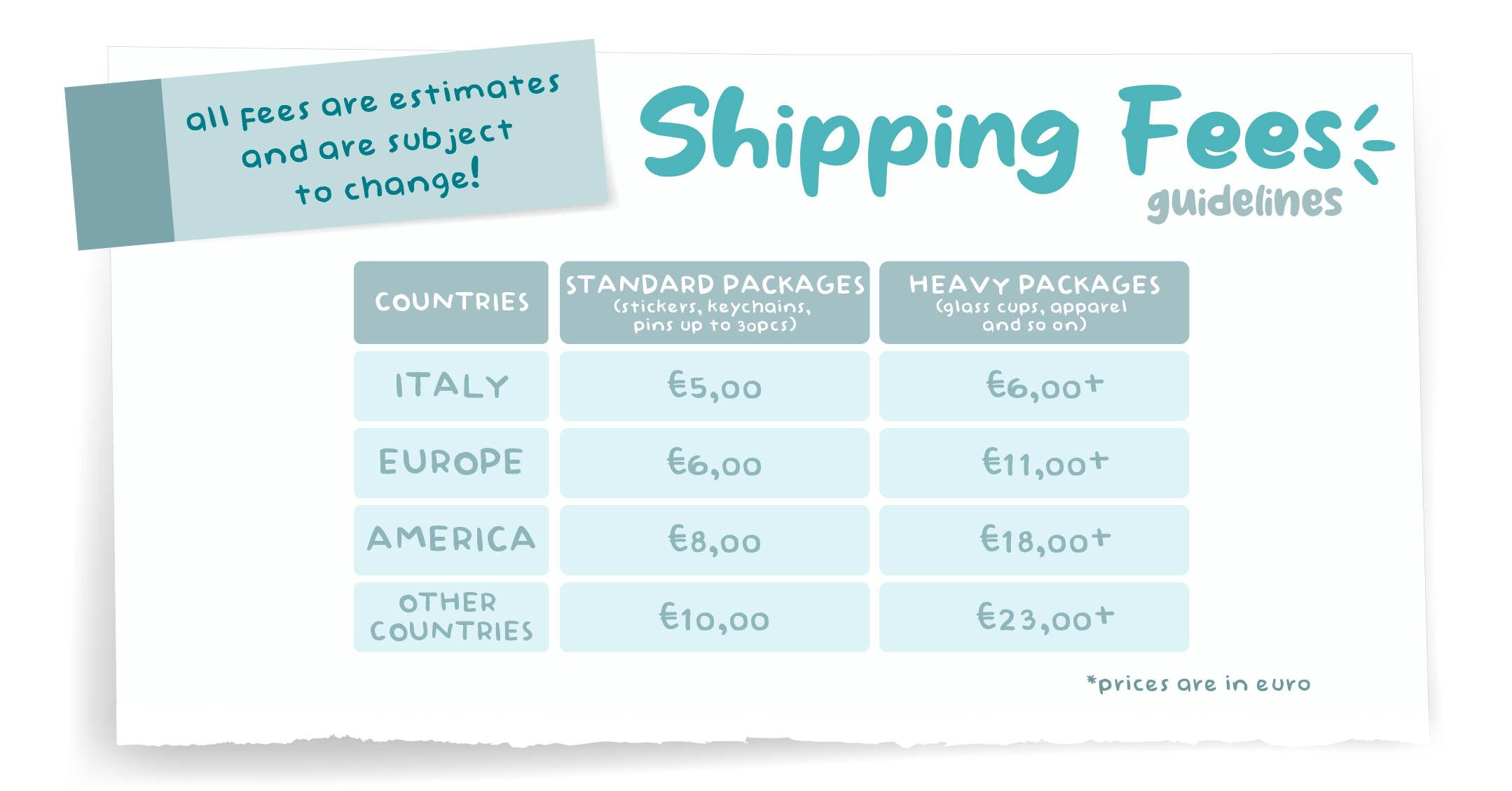 Shipping costs are based on the exact weight of the package and on its destination. We're based in Italy and send packages worldwide.