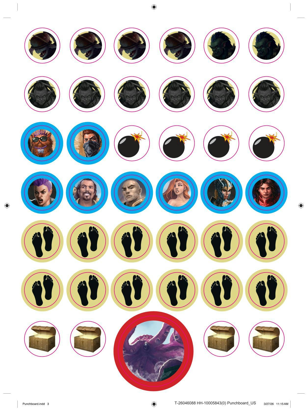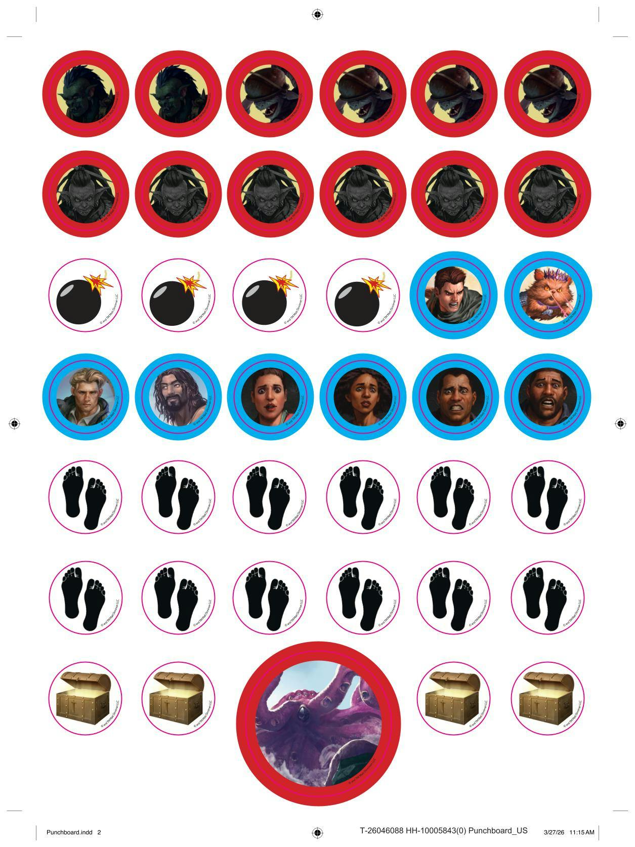 - 1 Sheet of High-Quality Punchboard containing 41 Double-Sided Tokens! These are black core paper tokens (for the normal people who aren’t paper material nerds, it means they’re gonna be real nice) featuring mobs, allies/playable characters, actions, and points of interest.