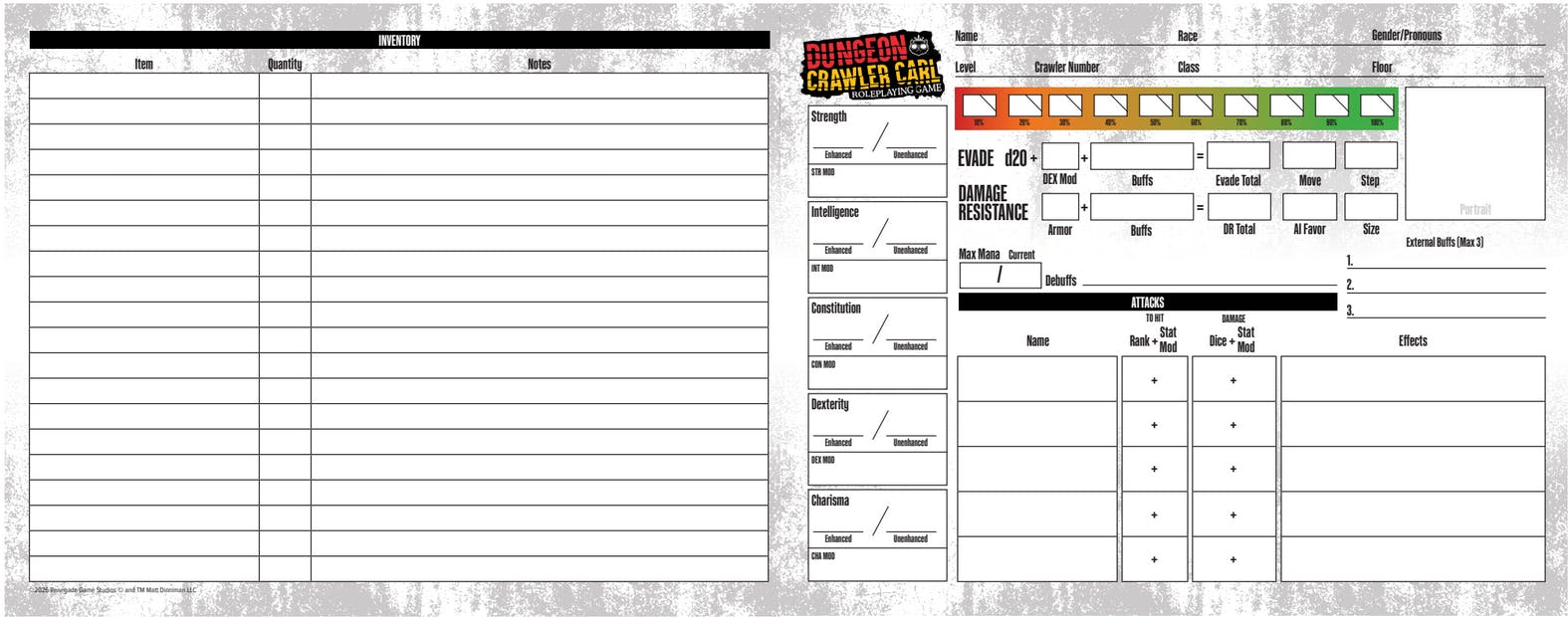 - 12 Blank Character Sheets for creating your own crawler!