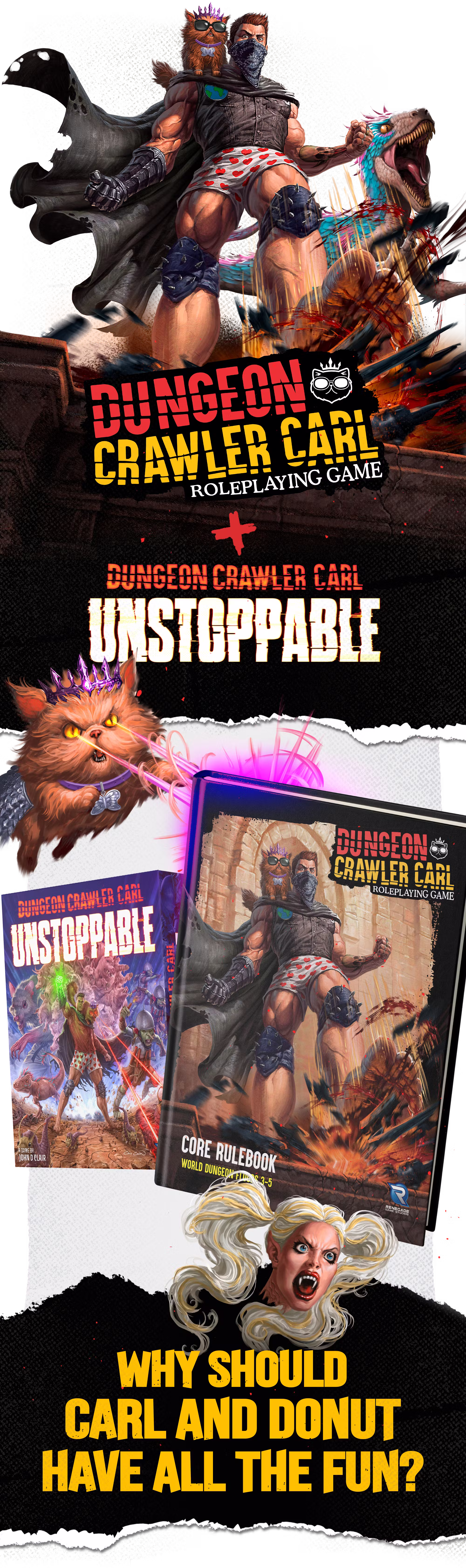The Dungeon Crawler Carl Roleplaying Game Starter Set has everything you need to bravely (or stupidly) dive into the World Dungeon! You and the other people of Earth can team up to fight mobs, battle bosses, and blow shit up in true Carl fashion. And who knows? You might just win the AI’s favor…