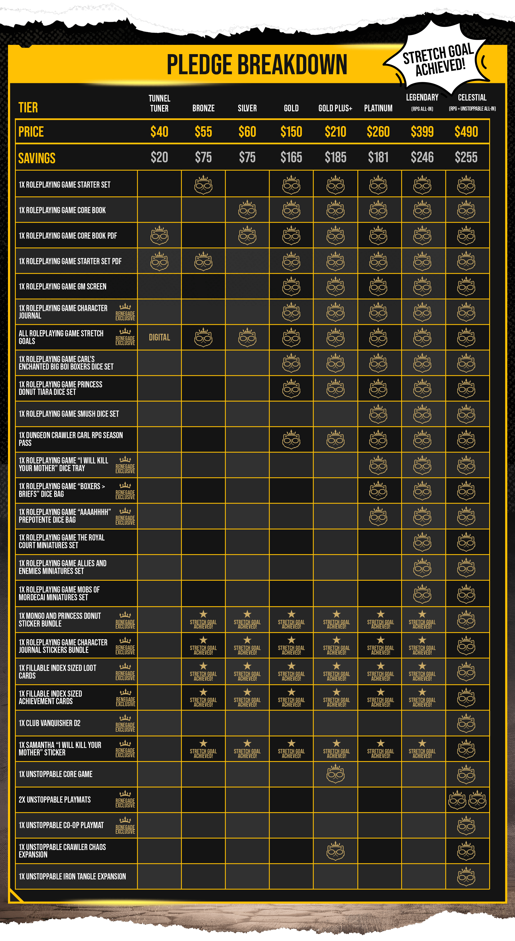 🐊 30+ playable races and a massive class roster with iconic subclasses 🎲 Includes rules and guides to make your own classes, races and more which means nearly infinite character combinations of backgrounds, skills, races, and classes 📦 Physical and digital products including dice sets, a GM screen, a character journal, miniatures, and more 💳 Flexible backing with BackerKit's Pay Over Time on pledges $150+ 🏆 Stretch goals and achievements to keep the campaign going