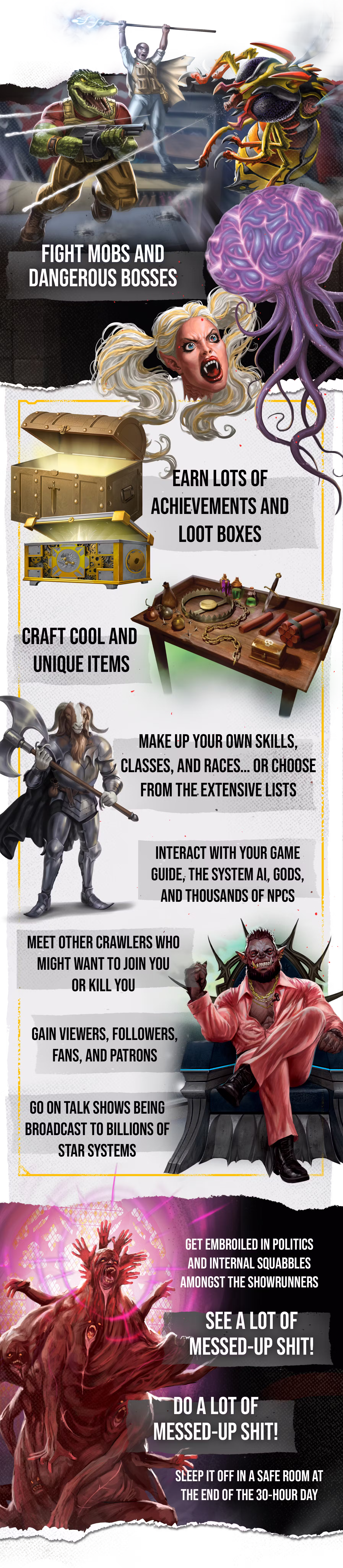 Fight mobs and dangerous bosses across an ever-deepening dungeon that gets harder the further you descend. Craft cool and unique items, make up your own skills, and choose from dozens of races and classes. The System AI, gods, factions, talk show hosts, and thousands of other NPCs are all waiting to make your life interesting for quadrillions of viewers. Other crawlers might want to join you. Or kill you. Sometimes both.