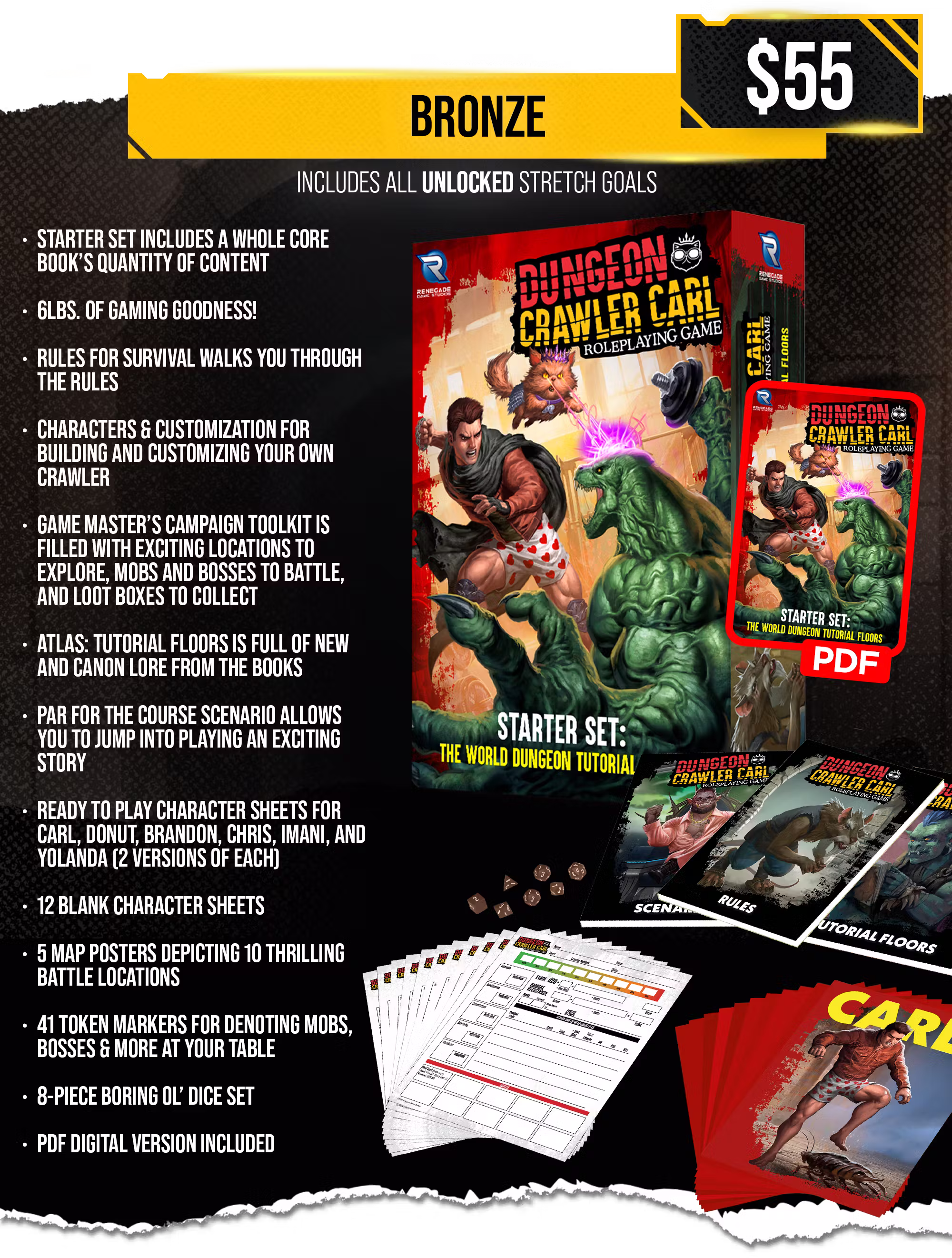 The Dungeon Crawler Carl Roleplaying Game Core Rulebook is 300+ pages focusing on world dungeon floors 3 to 5. This book will walk through character creation, skills, spells, neighborhoods, saferooms, loot, mobs and a whole lot more!