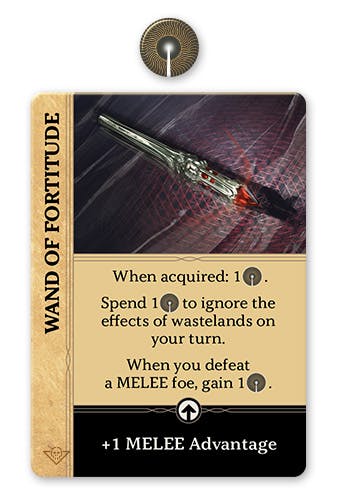 Quick look at a brand new kind of treasure: wands. Up until now, treasures have been either something you can use again and again or something you can spend for a one-time effect. In the Covenant expansion, we introduce wands. These treasures use a new resource, charges. Each starts with a number of charges when you acquire it, has a way to get more charges, and has an effect that you can spend charges to trigger. In this way, you can use the item over and over again, but you'll have to decide when to try and recharge the wand. This keeps with Covenant's general design philosophy of presenting the players with difficult choices between the typically optimal play and a less optimal play that provides an alternate benefit.