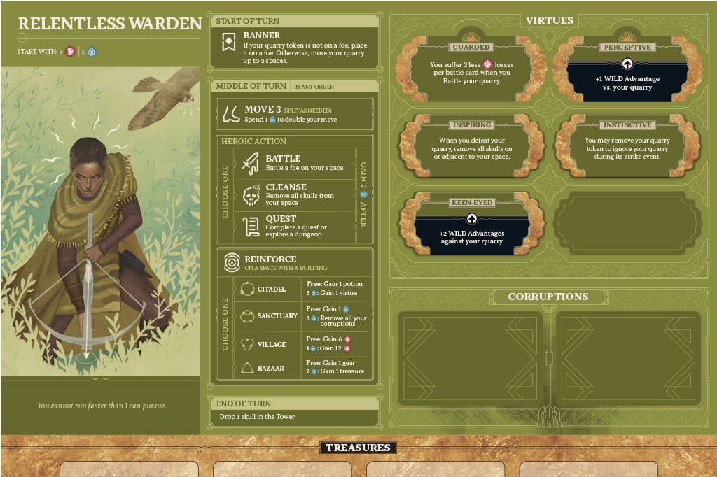 The Relentless Warden’s other virtues let you interact with your quarry in different ways. Inspiring lets you remove all skulls on or adjacent to your space after you defeat your quarry.