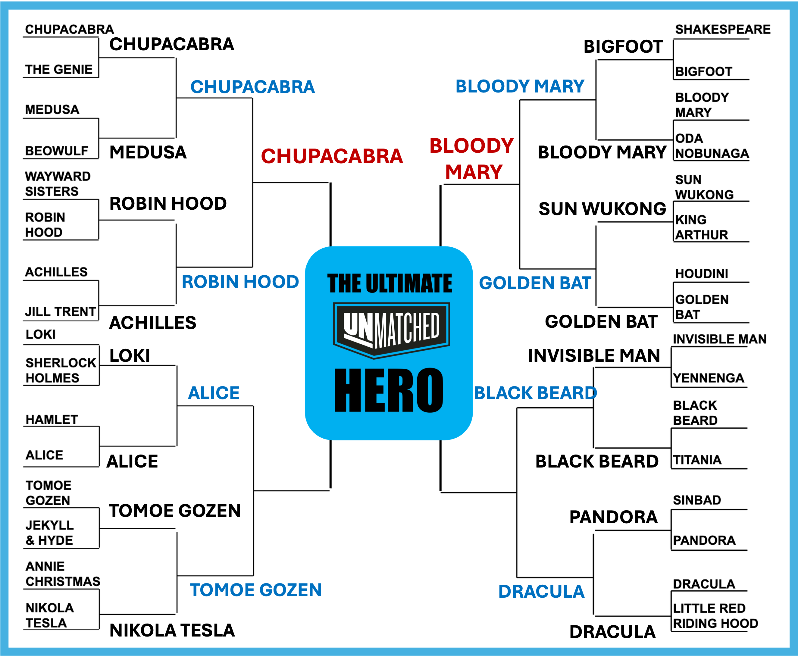 Each day, there will be two match-ups, and only backers will be able to vote. Voting will be open for approximately 24 hours for each match-up, with the winners announced once per day. All backers will get the FREE FOIL PROMO CARD of the winning hero!!! Who do you want to win?