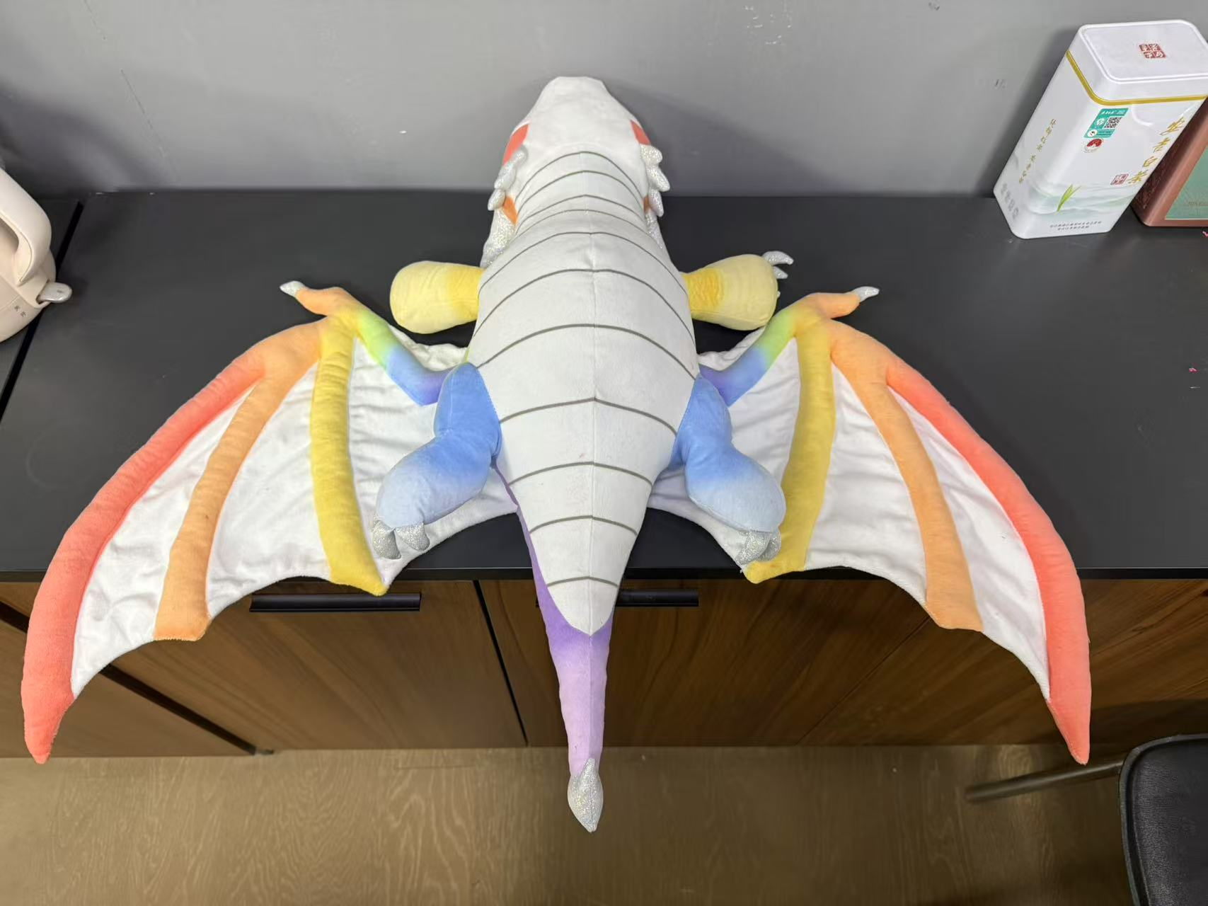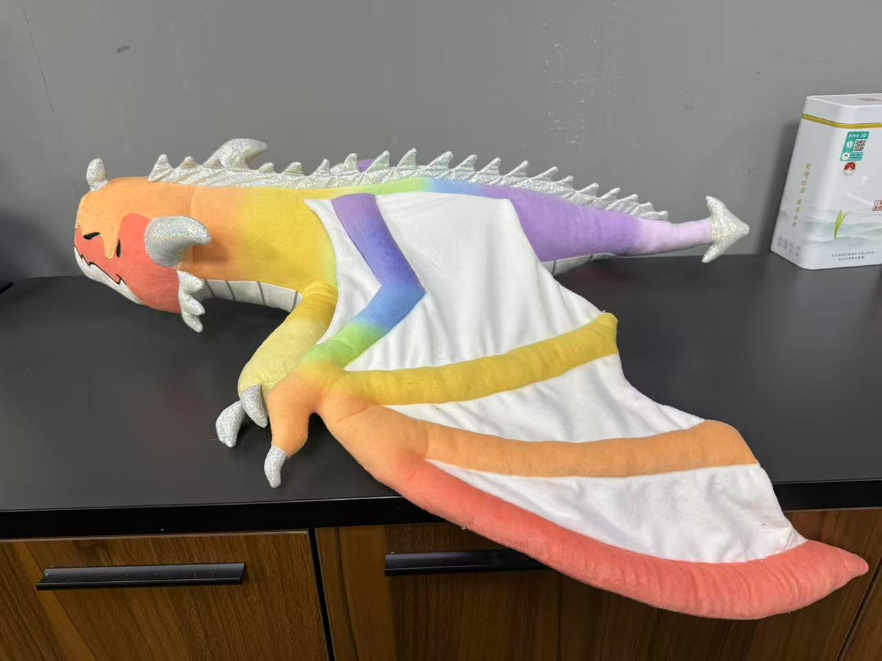 There were some slight revisions done on the Pastel Rainbow Dragon that included the following; -Silver/Gray belly lines instead of black to not be so stark against the white -Wing claw that had been accidentally turned around was righted -Embroidery of facial expression and nose/eyes added. Miscommunication about printing on previous example
