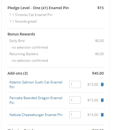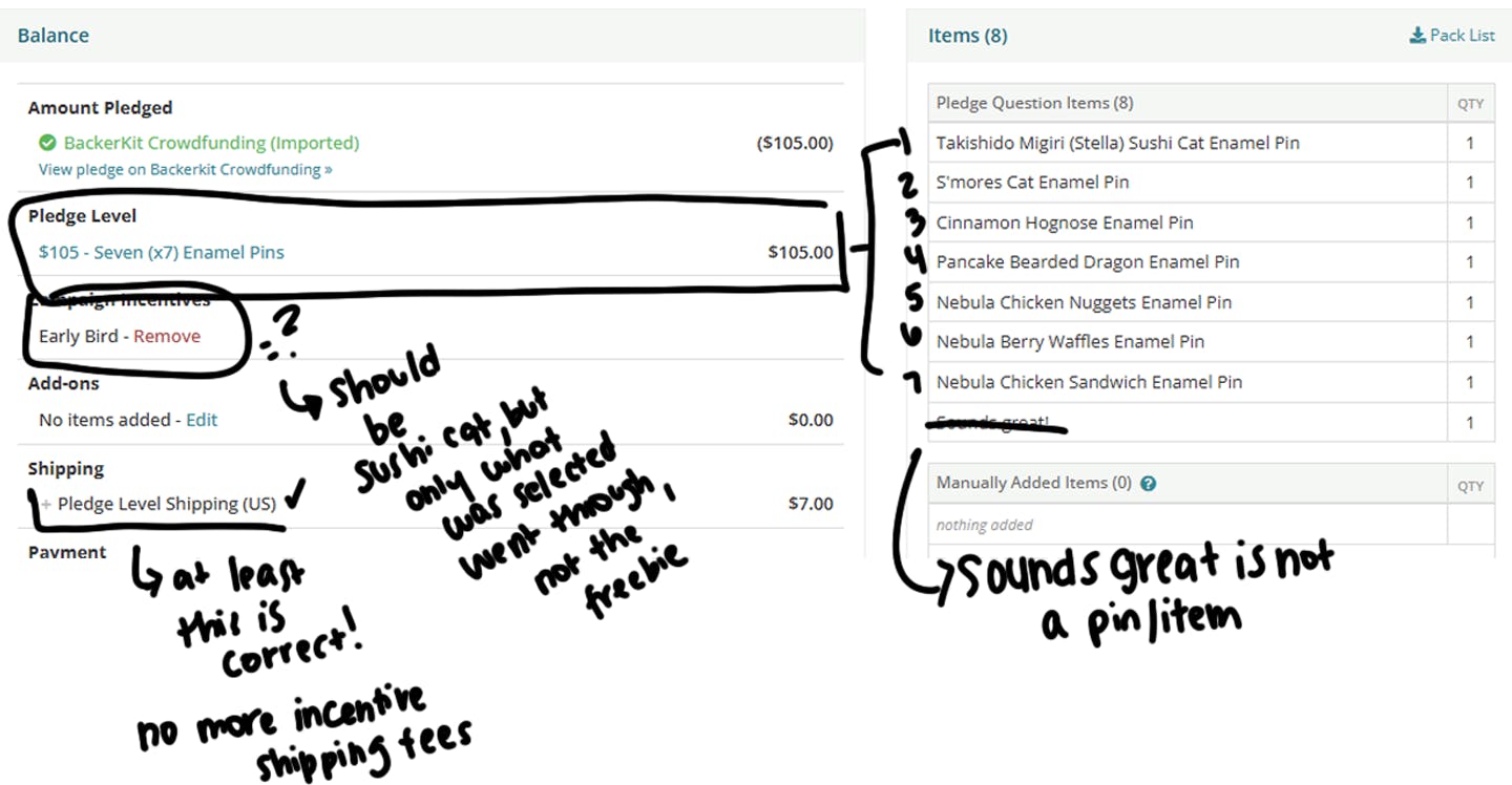So this person should have 7 selected pins of their choice + an 8th pin (the freebie, in this case the sushi cat is the early bird freebie). However, you can see it is not showing up on the right. There are only 7 pins + the sounds great sku that has no business being there at all.