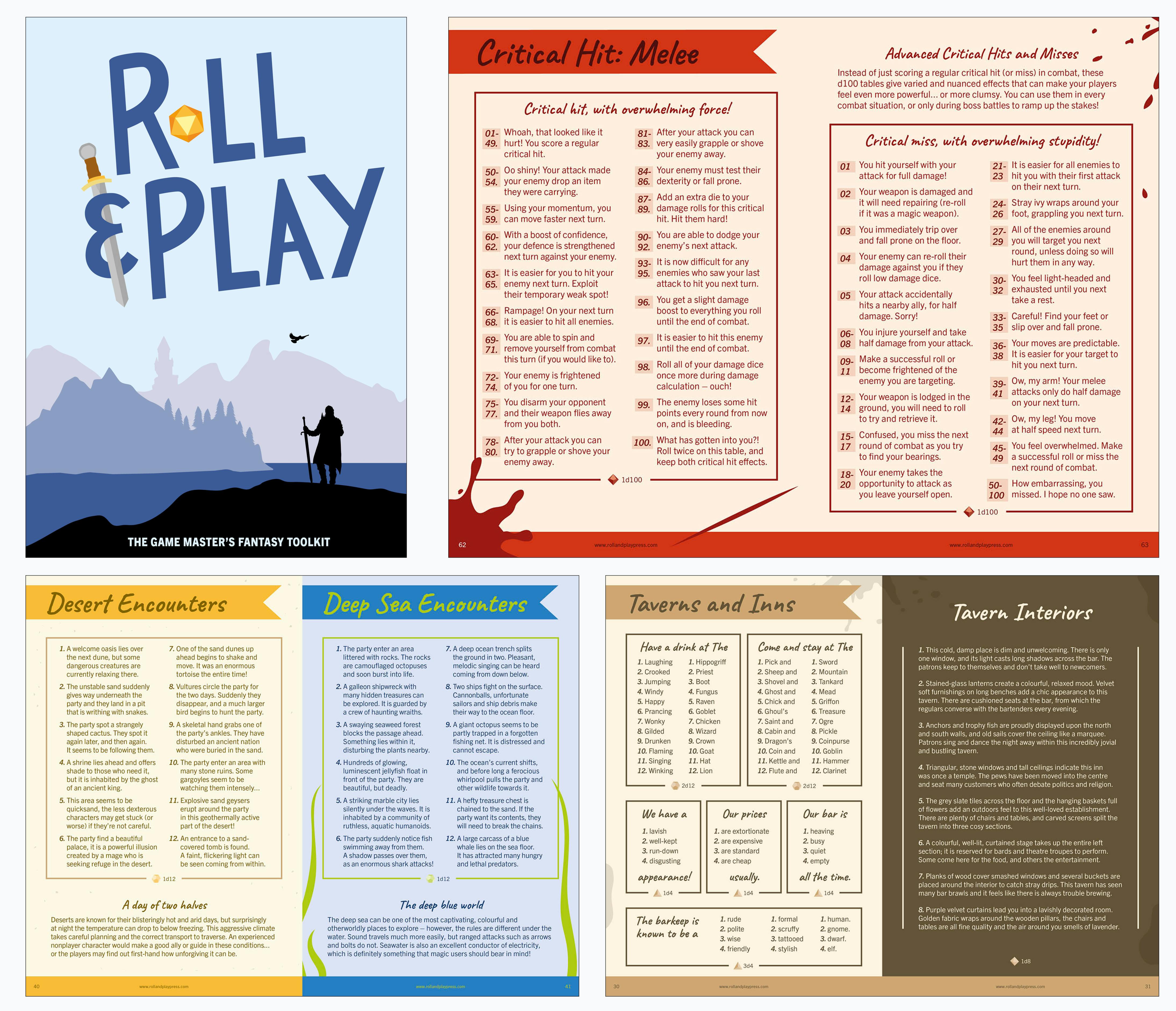 Whether you’re a beginner game master or have been running sessions for decades, The Game Master’s Fantasy Toolkit is a handy digital companion for anyone planning campaigns and improvising at the tabletop. The random tables within explore campaign ideas, organisation names, town features, tavern generators, random encounters for every environment, festivals, blessings, diseases, and so much more.