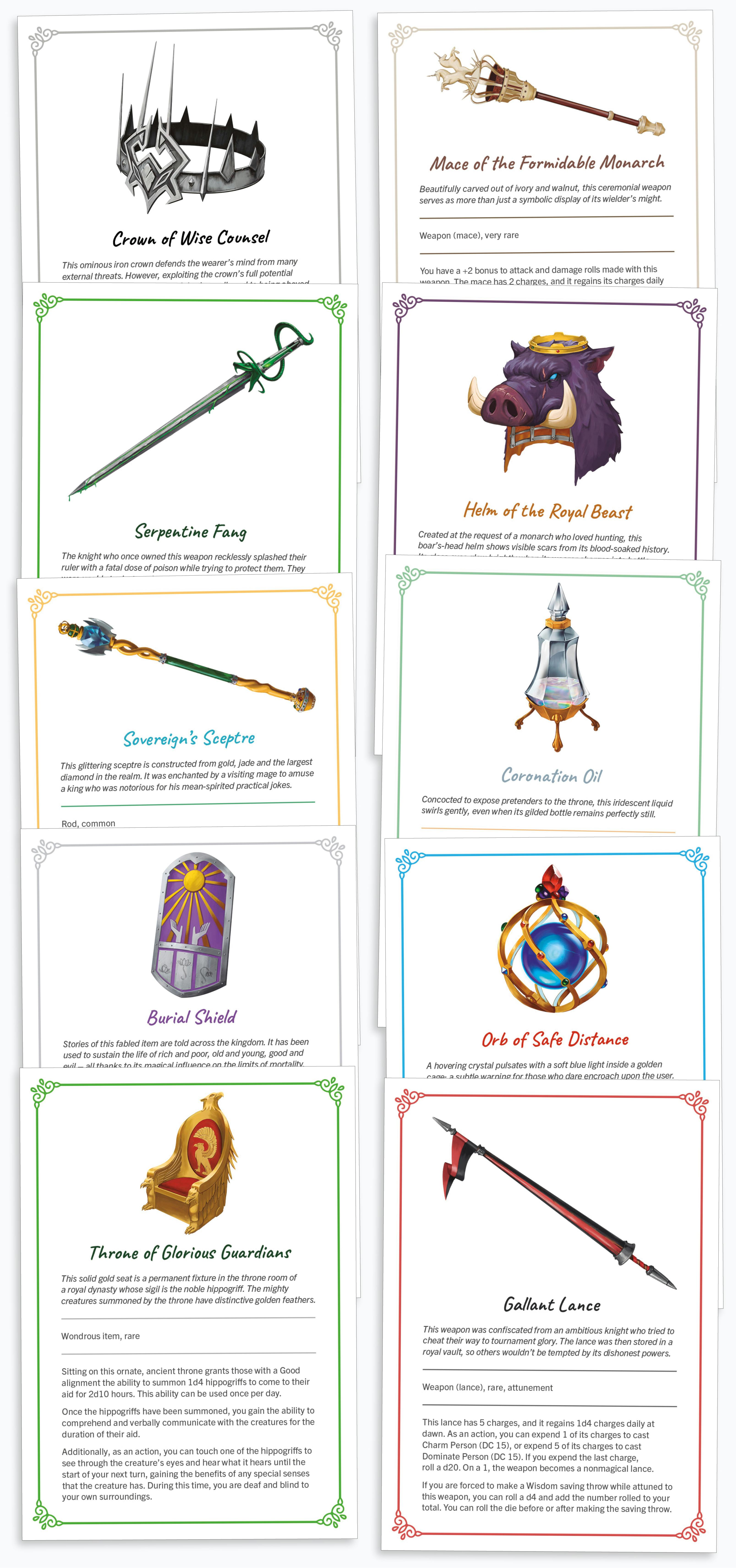 Fill your throne room and reward your party with a collection of royal treasures, ranging from a unicorn-topped mace to a gleaming, bejewelled orb. These ten ceremonial items aren’t just for show, their intriguing magical abilities will also enrich combat and other role-playing moments. Collated in one PDF, all ten items feature stats compatible with 5E to help you easily integrate them into your game and are brought to life with stunning rendered illustrations.