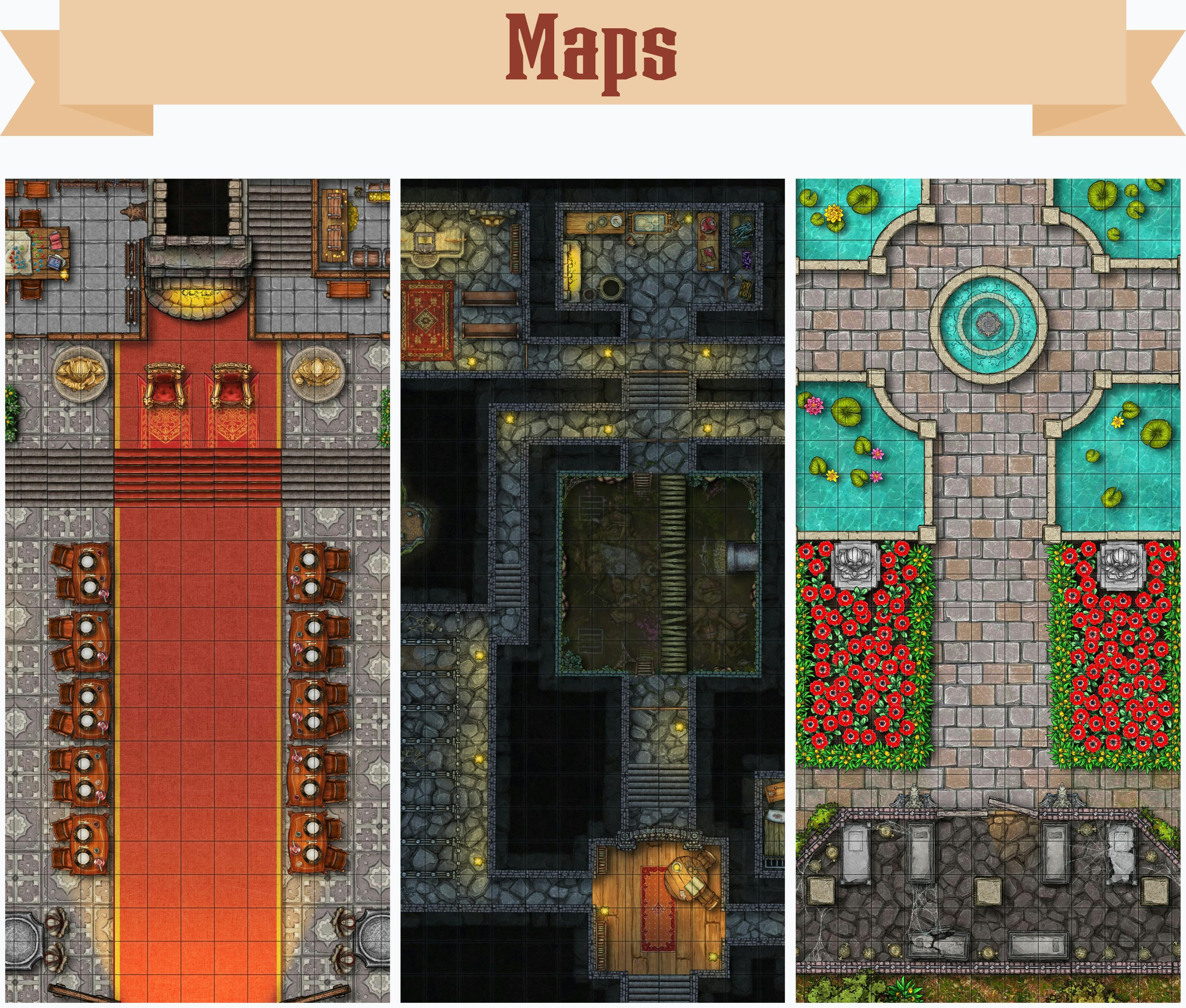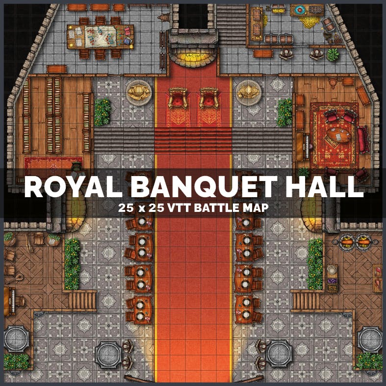 Set the scene for a palace showdown with three virtual battle maps. These locations could become home to your new monsters, or used for battles whenever your party visit a castle or other royal residence. The maps are 25x25 square and will be delivered as high-res jpegs (gridded and non-gridded) for VTT games.