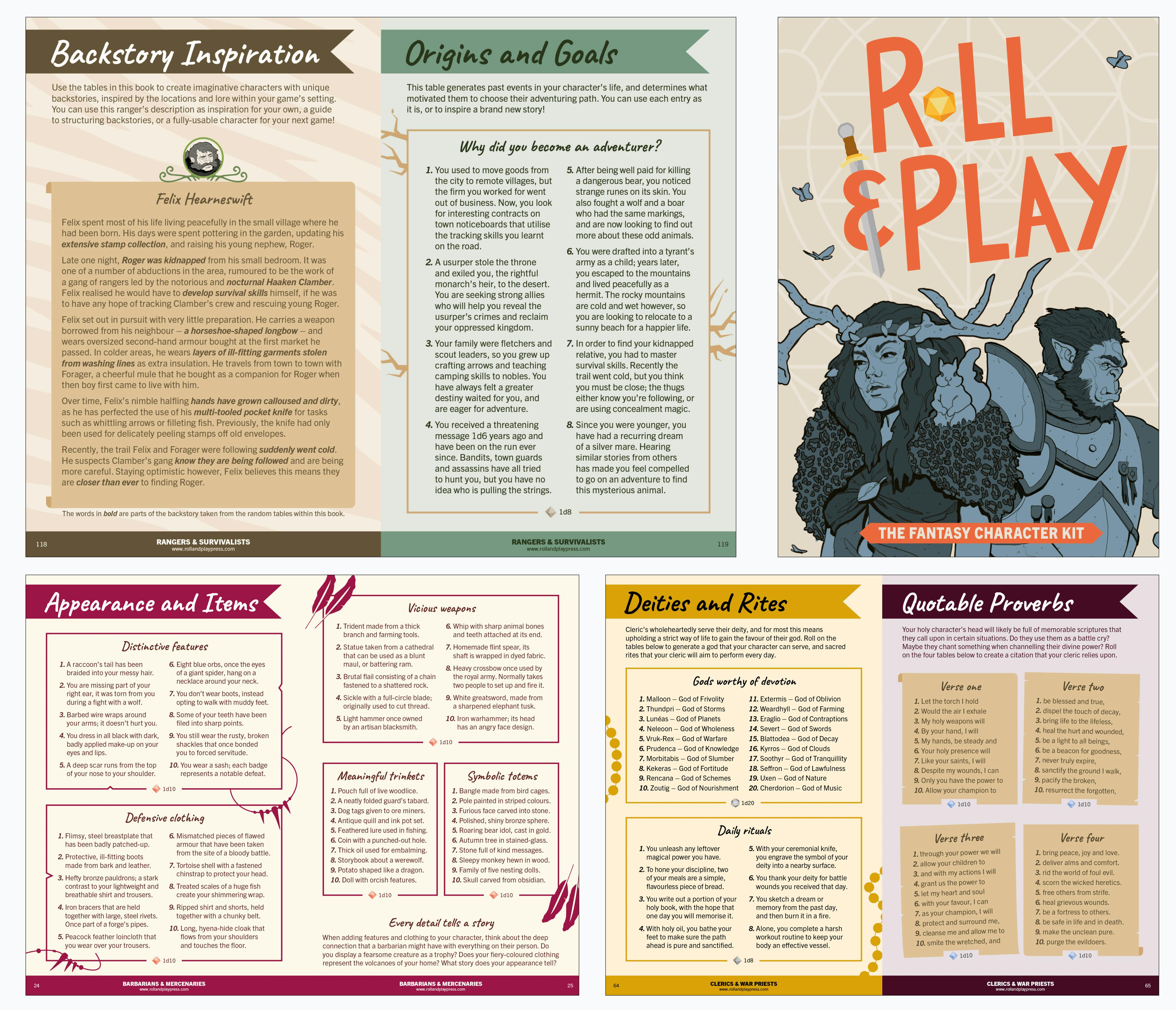 By taking ideas and inspiration from the breadth of random tables within The Fantasy Character Kit, your campaigns will soon be full of memorable characters and unforgettable role-playing moments that will bring a totally new dimension to your games! Each of the fourteen chapters covers a different RPG class, from bard stories to wizards spellbooks, or ki manifestations to otherworldly patrons, this digital book has everything a game master or player needs to create incredible characters.