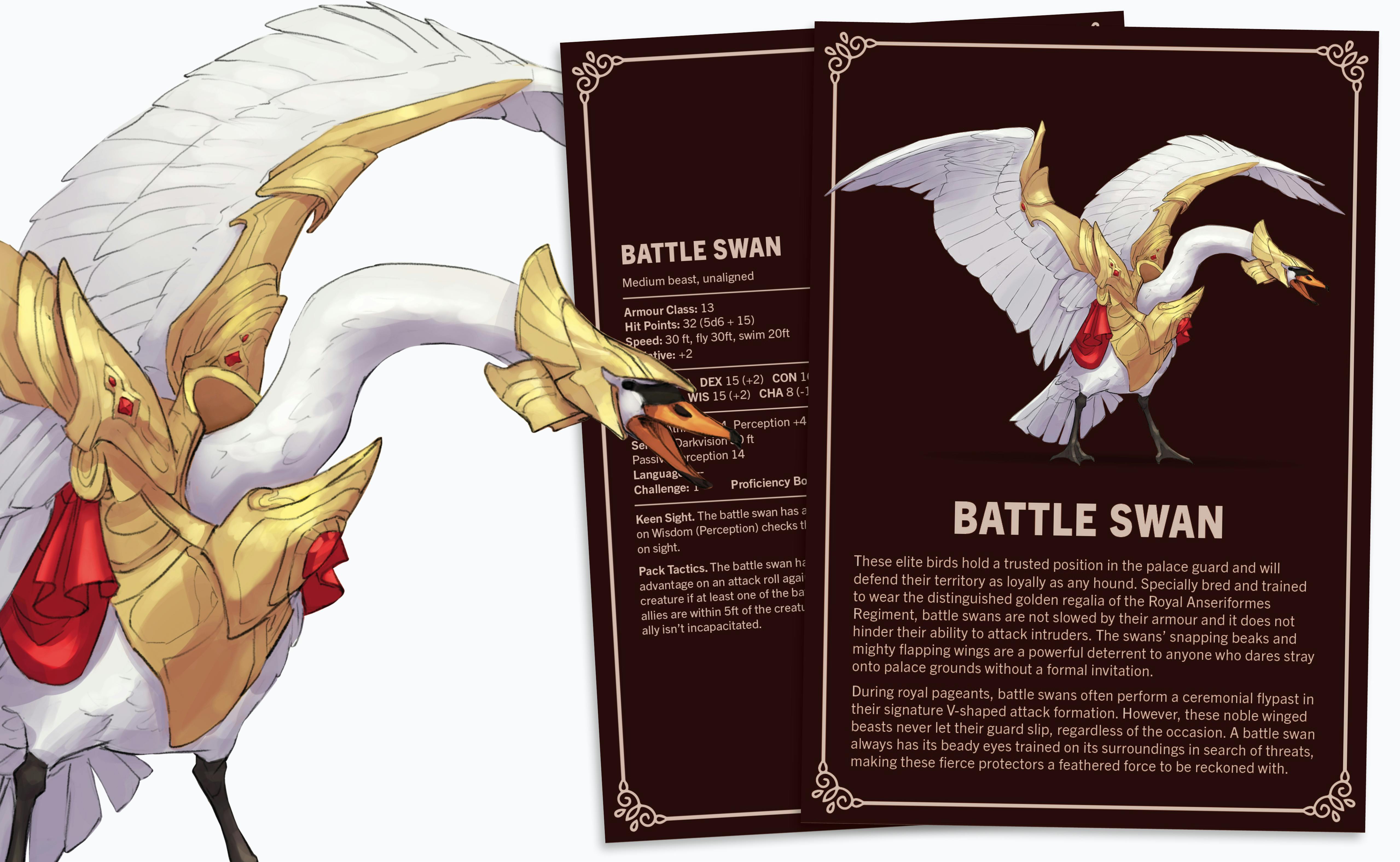 Face a squadron of fiercely loyal battle swan guards, ready to defend palace grounds in a flurry of feathers and fury.