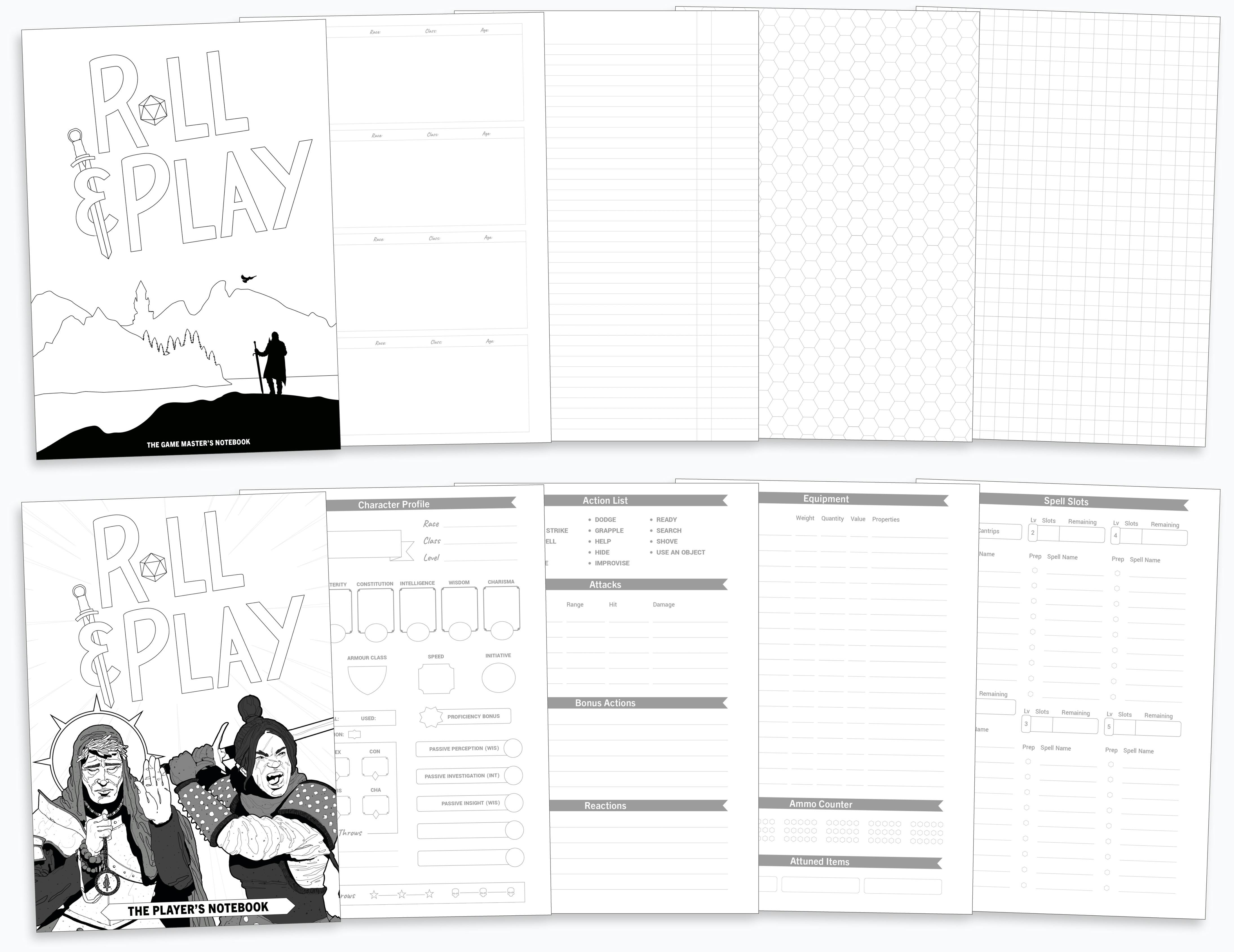 Keep your session notes, maps, dungeons and characters organised with printable pages from The Game Master’s Notebook and The Player’s Notebook. With hex and square grids, an integrated 5E character sheet, spell slot trackers, equipment lists, ammo trackers and more, you and your players will be prepared for wherever your next game takes you!