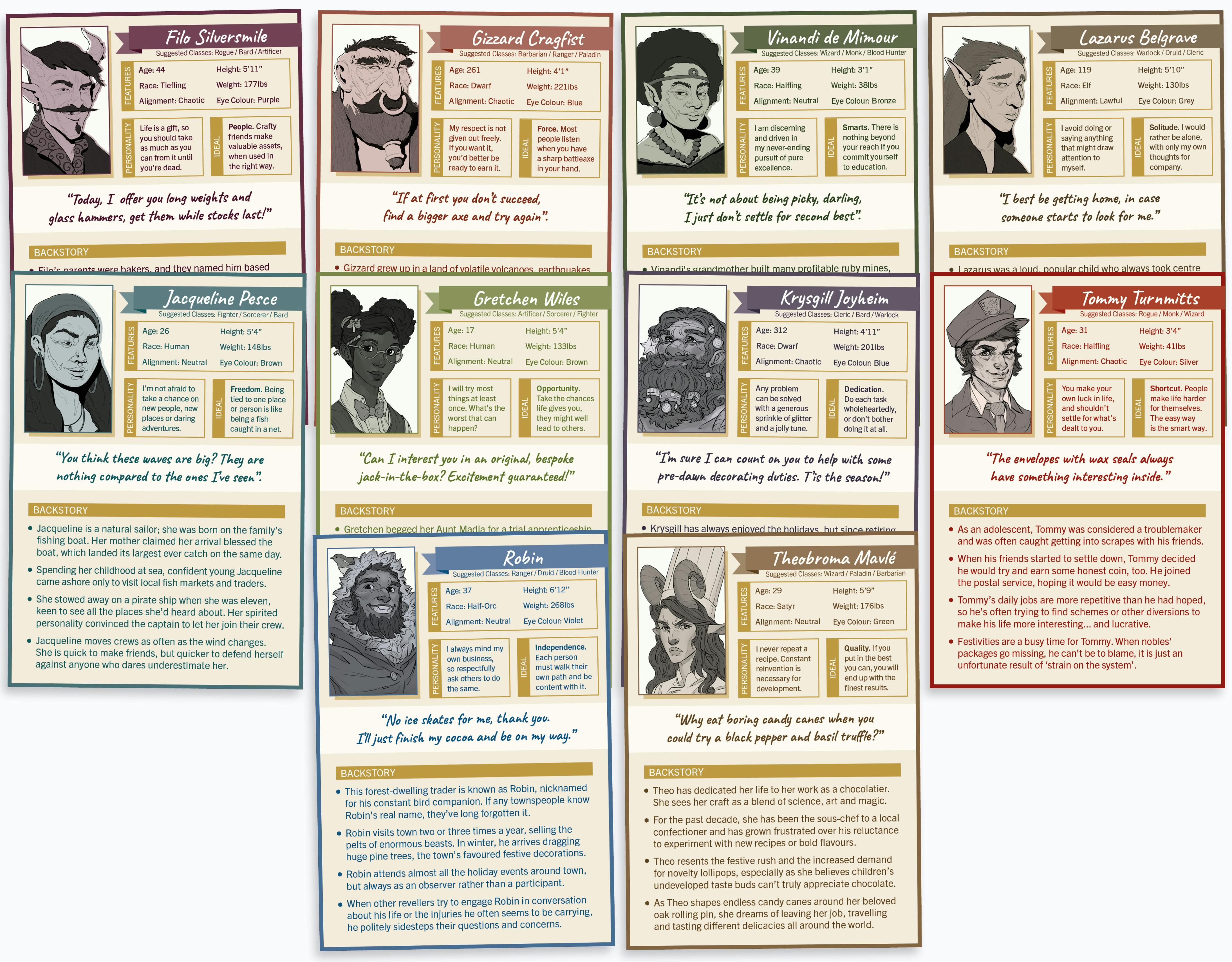 Fill your games with a selection of wonderfully unique and detailed NPCs with these handy character cards. Or, hand these cards out to the players at your table and supply them with an interesting character to embody at the tabletop – including a suggested class, backstory, personality and alignment!