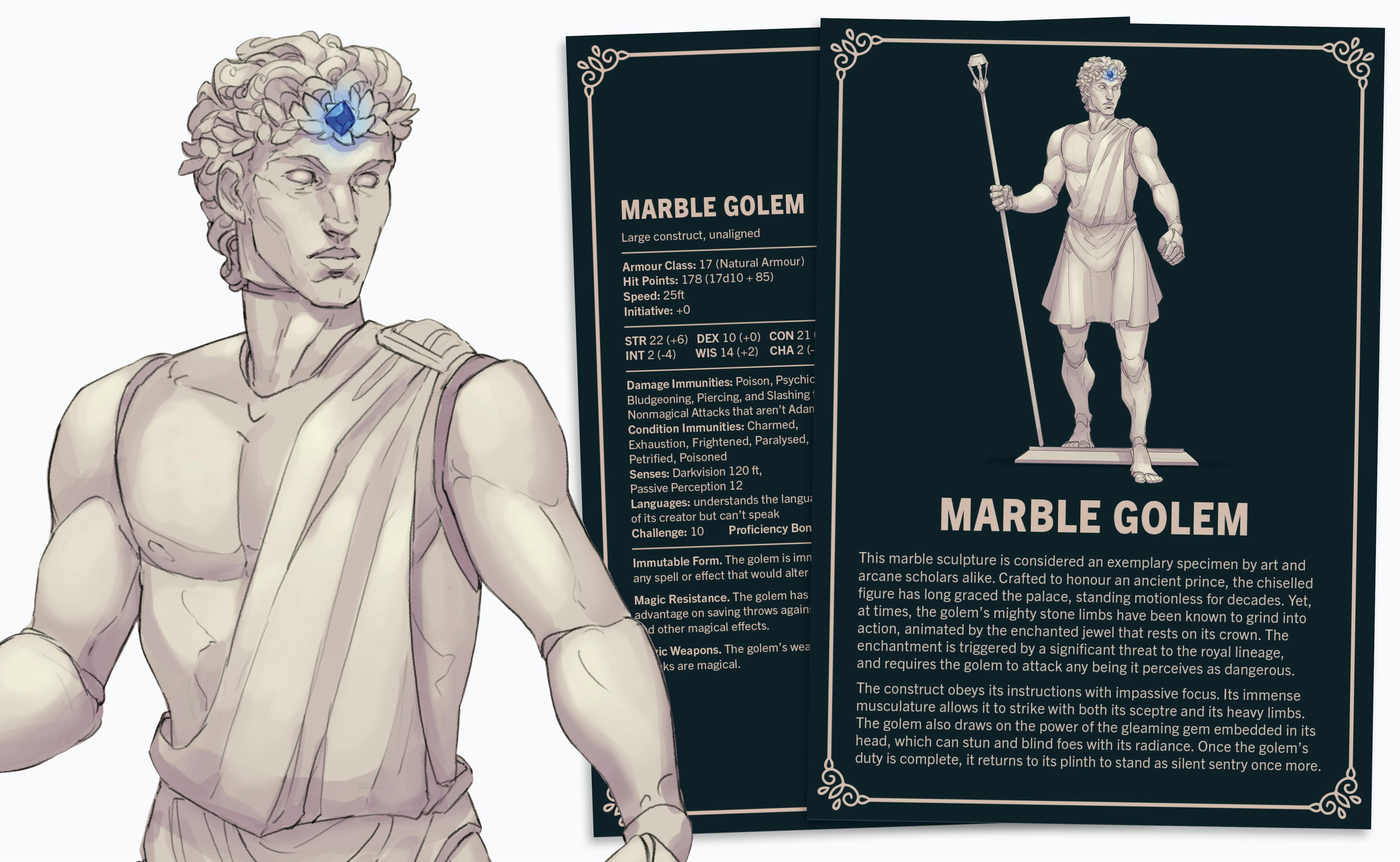 Behold this majestic statue, enchanted to defend its sovereign without question. This mighty marble guardian makes for an epic encounter.