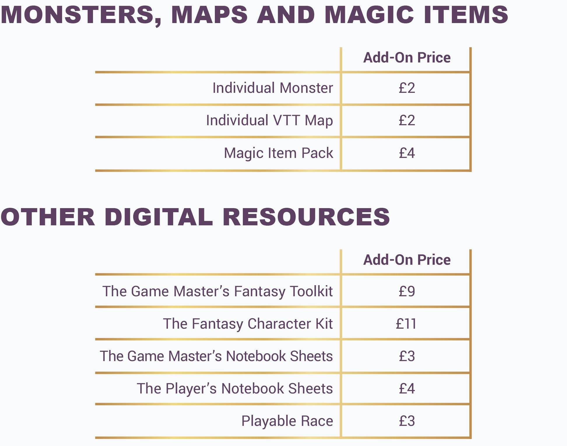 When filling out your pledge manager (after the campaign has finished), you will also have access to our Add-On Store. If you would like to, you will be able to purchase additional individual items at this stage, which will be included in your pledge. These include digital items from this campaign as well as digital versions of our previous projects, and will be charged at the values below: