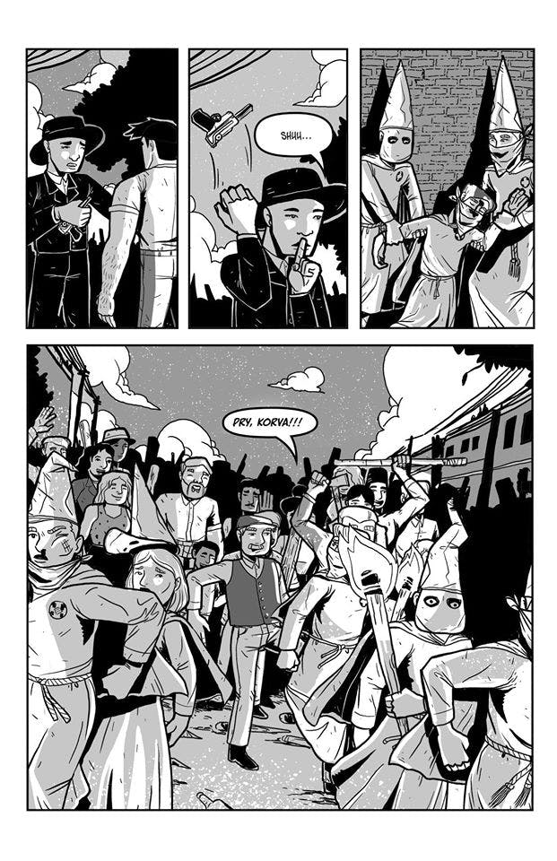 Many of you may already be familiar with the graphic novel that Bizhan Khodabandeh and I did back in 2021, THE DAY THE KLAN CAME TO TOWN (Honorable Mention for Graphic Novel of the Year by Publishers Weekly). For those of you who are not, it's about a Klan riot that happened in my hometown, Carnegie, PA, when, in a show of white supremacist force, the Ku Klux Klan marched 30,000 people on the borough of 10,000, targeting the Irish, Southern and Eastern Europeans who lived there. They outnumbered the immigrants 10 to 1 in the streets, and the Klan lost. However, in a case of purposeful "amnesia," this historic riot became a town secret until Bizhan and I came out with the book.