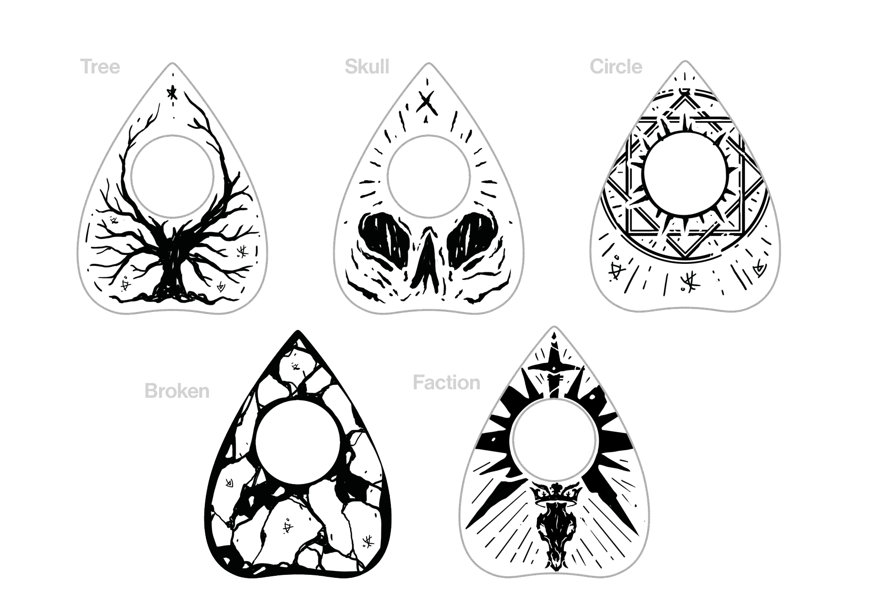 We’ve also restyled the Doom tracker as a planchette, in keeping with the spiritualism that shapes incursions into a Hollow. We haven’t picked a design yet (there’s not a bad one in the bunch) but we’re leaning towards Tree. What do you think?