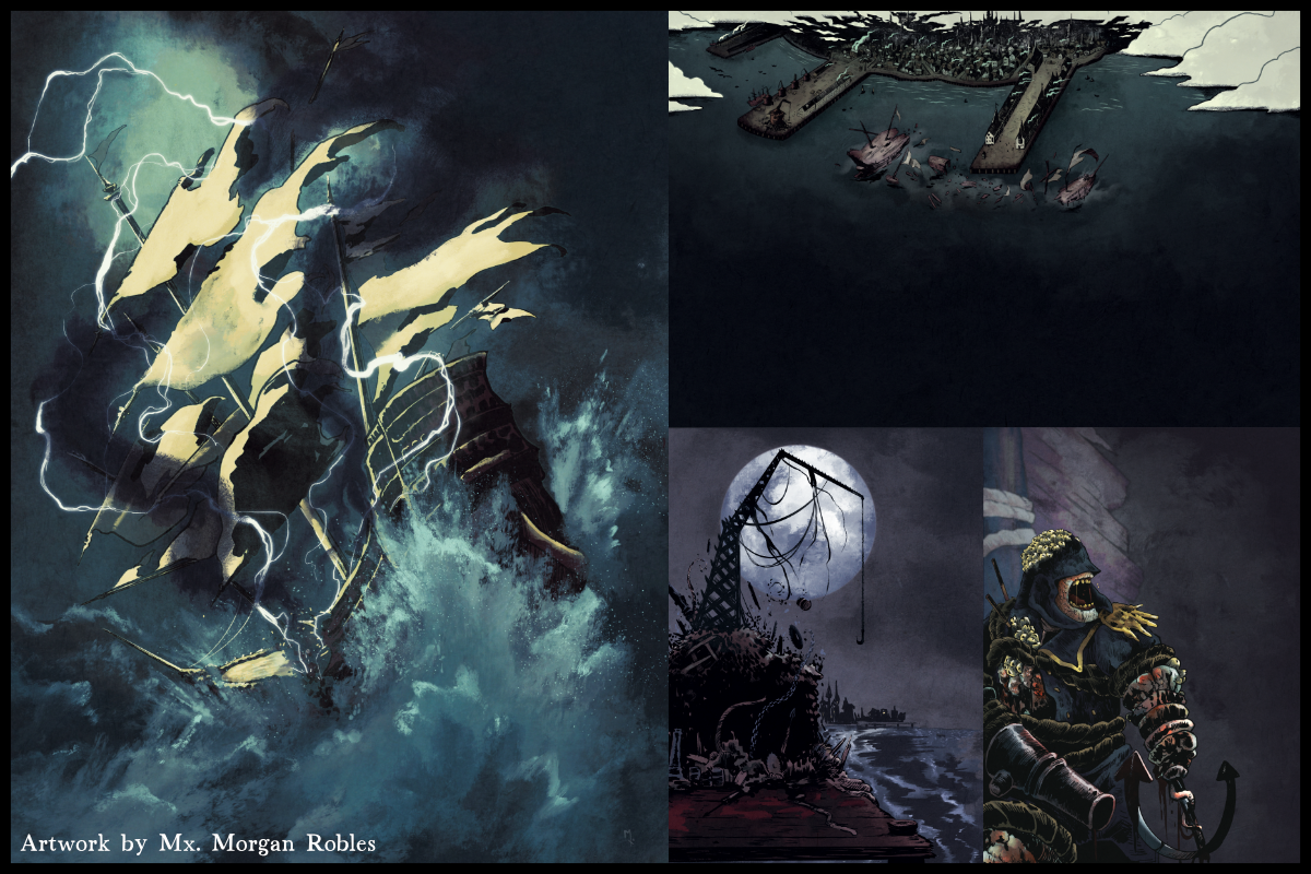 We have eight complete Hollows, and the author is working on the ninth one in our virtual office co-working space as I type. This collection's looking good, folks. And the art! Oh my goodness, the art! This month, I’ll send you off with these absolutely revolting works by Morgan Robles, for Sasha Sienna and Helen Gould’s Hollow. This was formerly called The Lord of the Dockyard and is currently Break! Break! Break! – the story of a mutineer who Hollowed when his uprising failed and he proved powerless against the navy that crushed his spirit.