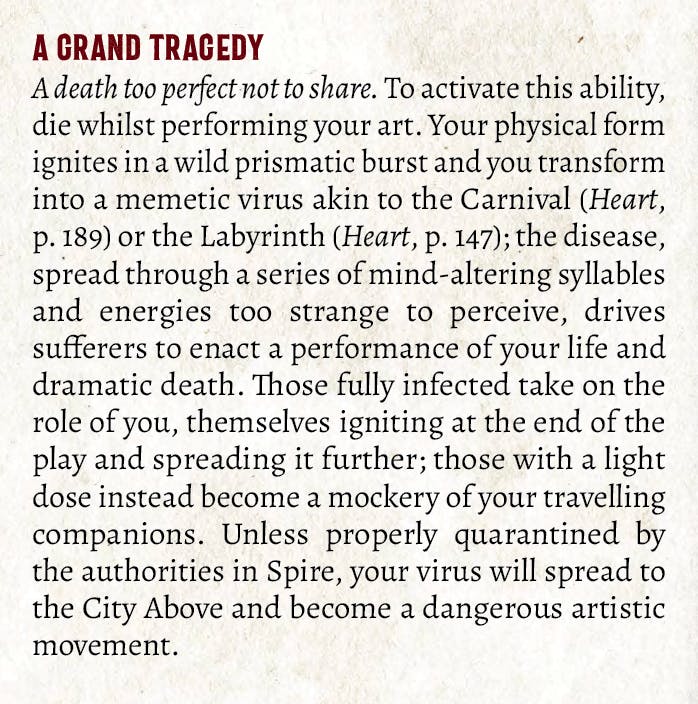 Anyway, this is kind of the villainous Zenith; your life is transmuted into a play that spreads like a virus. And while everyone in every future campaign can sing your title track and get some healing, it’s more that you get to transform part of the City Beneath so it’s about you. It contrasts with the other Zeniths which range from selfless (play a song so sweet you can enchant the flood and lead it away from the settlement) to cheeky (set up an interdimensional boozer). There’s some overlap with the Firebrand High Advance from Spire where you become a song of revolution, but THIS one has some rules in it. Because I’m a better designer now.”