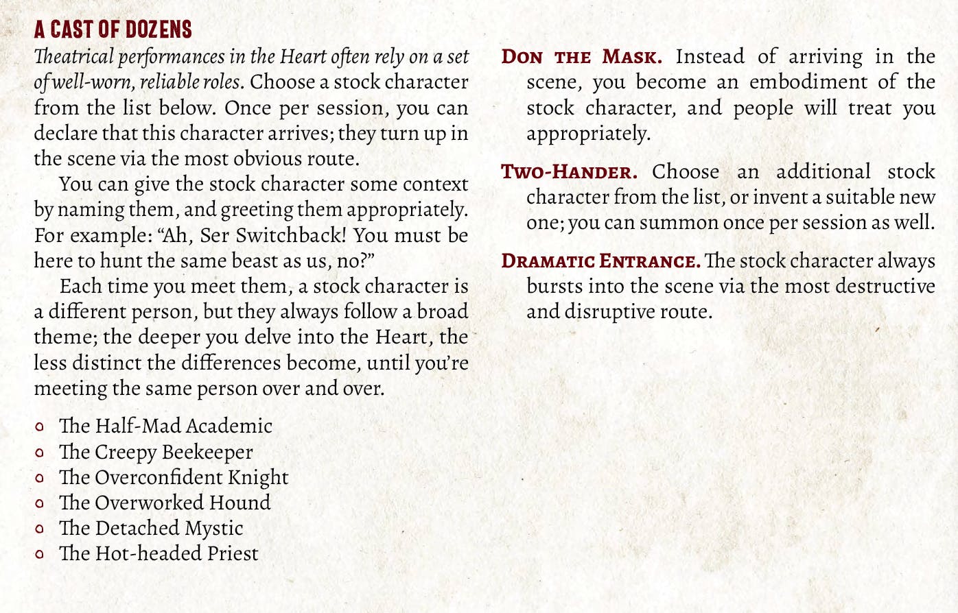 Given the often lonely nature of Heart games (when compared to the bustling metropolis of Spire), I wanted a way to bring in a recurring character. And I figured that the Heart probably has improv theatre, given the lack of a central authority to disseminate plays, so maybe the Witness can do a bit of magic and pull one of those stock characters out for a scene to help. (Is it a real person? Is it just the stock character in the flesh? Both? I dunno.)