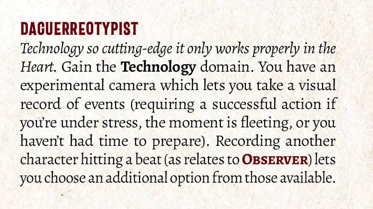 Grant Howitt: “Felix put some cameras on the class art and I decided that I had to make something of that. The Daguerreotypist ability undercuts Observer, which is all about helping people achieve their aims, and instead offers the chance to earn just as much out of it when you help them as when you stand back and take a picture. It’s a joke, effectively; the Witness runs off from the fight and sets up their big old-timey camera on a tripod and struggles to get the perfect shot. I didn’t want them to be too subservient.”