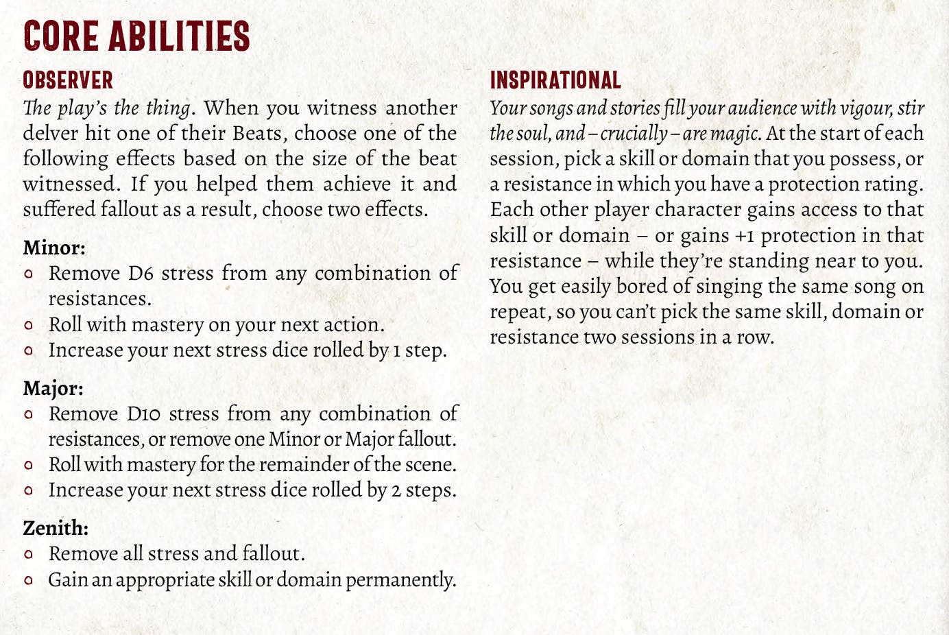 Inspirational is a catch-all attempt to round up “Inspire Competence” and all that low-level, almost ambient bonus stuff a D&D Bard has. You can support your team (assuming you have a broad range of skills or domains to do so) and you don’t have to faff about with the visual of singing a jaunty tune to help someone sneak or intimidate or whatever. You just pick it at the start of the session and get on with it.”