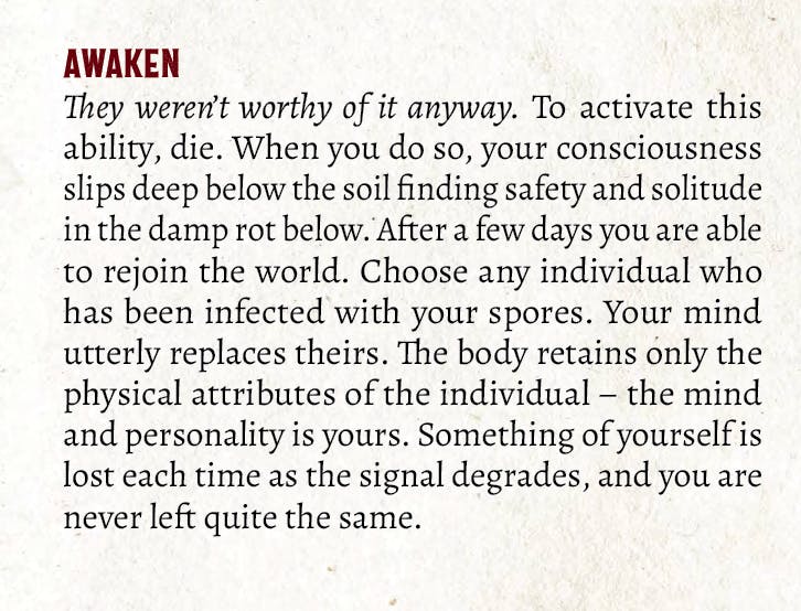 Chris Taylor:“Saprophyte was one of the first abilities I wrote for the class. It’s one of the few that doesn’t use the spore mechanic but I still love it. Fungus is always associated with rot and decay and the growth of something beautiful from putrescence is a lovely image. I am also absolutely rubbish at any video-game that uses stealth, so a way to both easily hide a body and get a refresh out of it was too good an opportunity to pass up.”