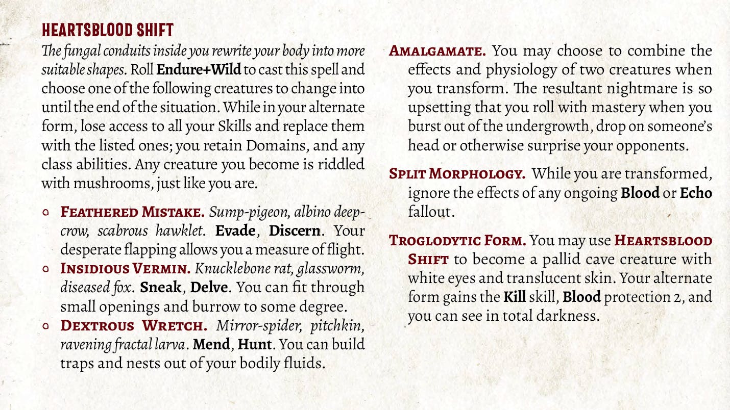 Chris Taylor:“Heartsblood Shift is perhaps the most obvious link to the Druidic origins of the class. Here we have the classic shapechange. I’ve always enjoyed the min/maxing aspect of character creation so knew immediately that just letting the class change into anything was a recipe for disaster. So the Shift was born. Pick a wretched form and gain new abilities! (while temporarily losing the old ones. Become an awful rat and sneak anywhere, fly above the situation as a sort of lumpy pigeon, or excrete dangerous traps and hunt in the darkness. Of course as you hit more beats you gain the ability to mix the forms of these nasty little mistakes. We can also see in Split Morphology the beginnings of a kind of tanking playstyle which I always really enjoy, especially in a game where getting Fallout is the fun bit.”