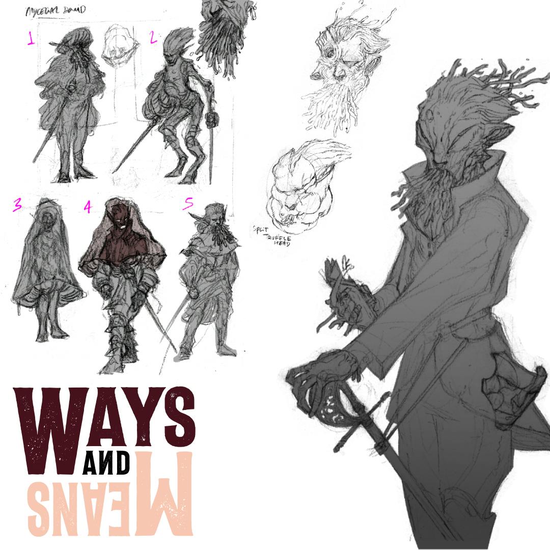 As with all the classes in Ways and Means, the task of visualising the Blightborn fell to Felix Miall. We wanted a character which didn’t lean on the traditional depictions of a druid in fantasy. So out were leather and pelts, wooden antlers, and all that jazz. Instead we wanted to stick with the classic Heart concept that someone from the Spire, a relatively metropolitan city, had been infected with these spores and pulled down into the Heart as a last resort.