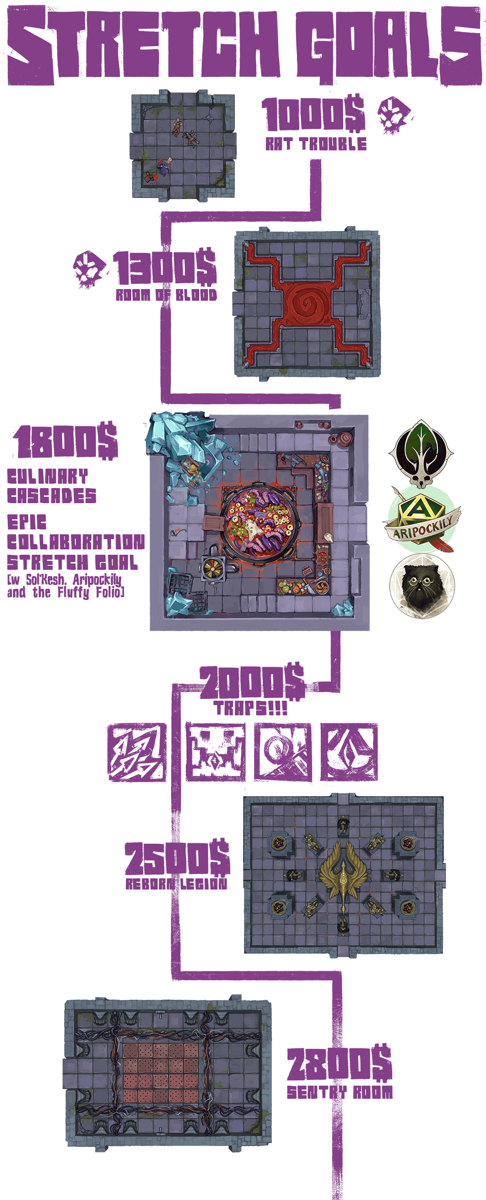 1800$ – Culinary Cascades (Dungeon Tile). Chaotic Kitchen in a need of Chef including brews from our friends and collaborators The Fluffy Folio, Sol'Kesh and Aripockily.