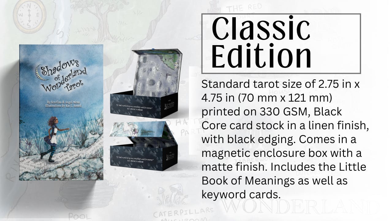 Every pledge brings us one step closer to Wonderland, and we invite you to journey with us. After all, the best adventures begin with a little curiosity. And, with your help, we can bring Shadows of Wonderland Tarot from dream to reality. Your support will help us produce a beautifully crafted deck, available in three editions: