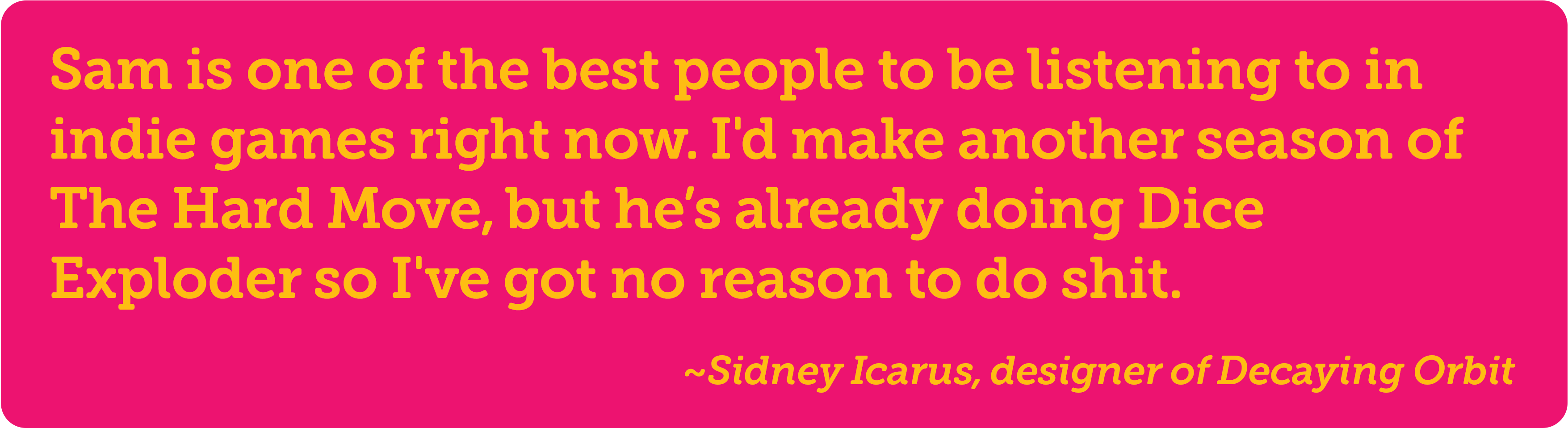 If you've never listened to an episode before, I especially love the one with Alex Roberts all about Love and Pity in Kagematsu and the one with Mikey Hamm about, what else, exploding dice.
